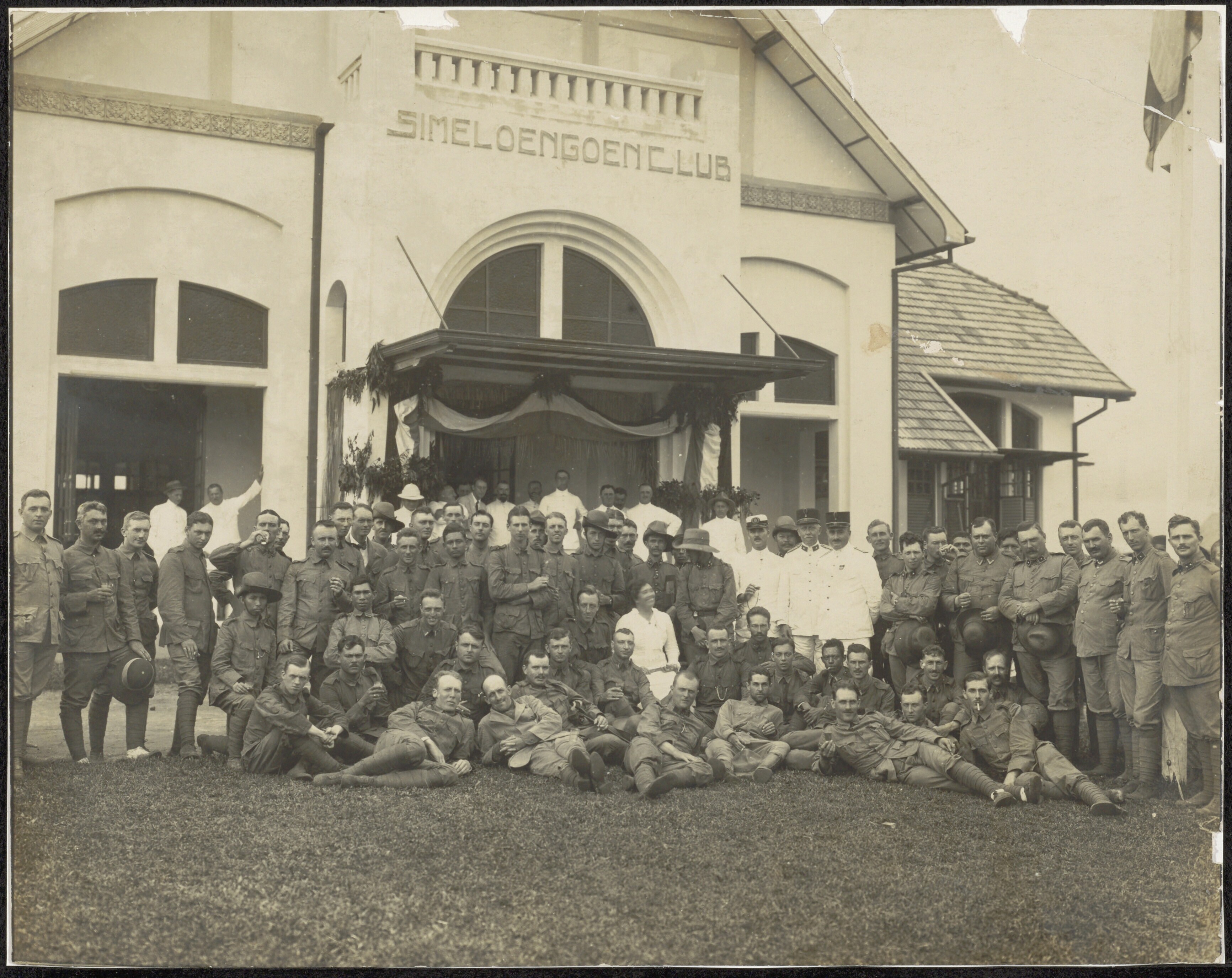 Groepsportret van militairen van het KNIL voor de Simeloengoenclub