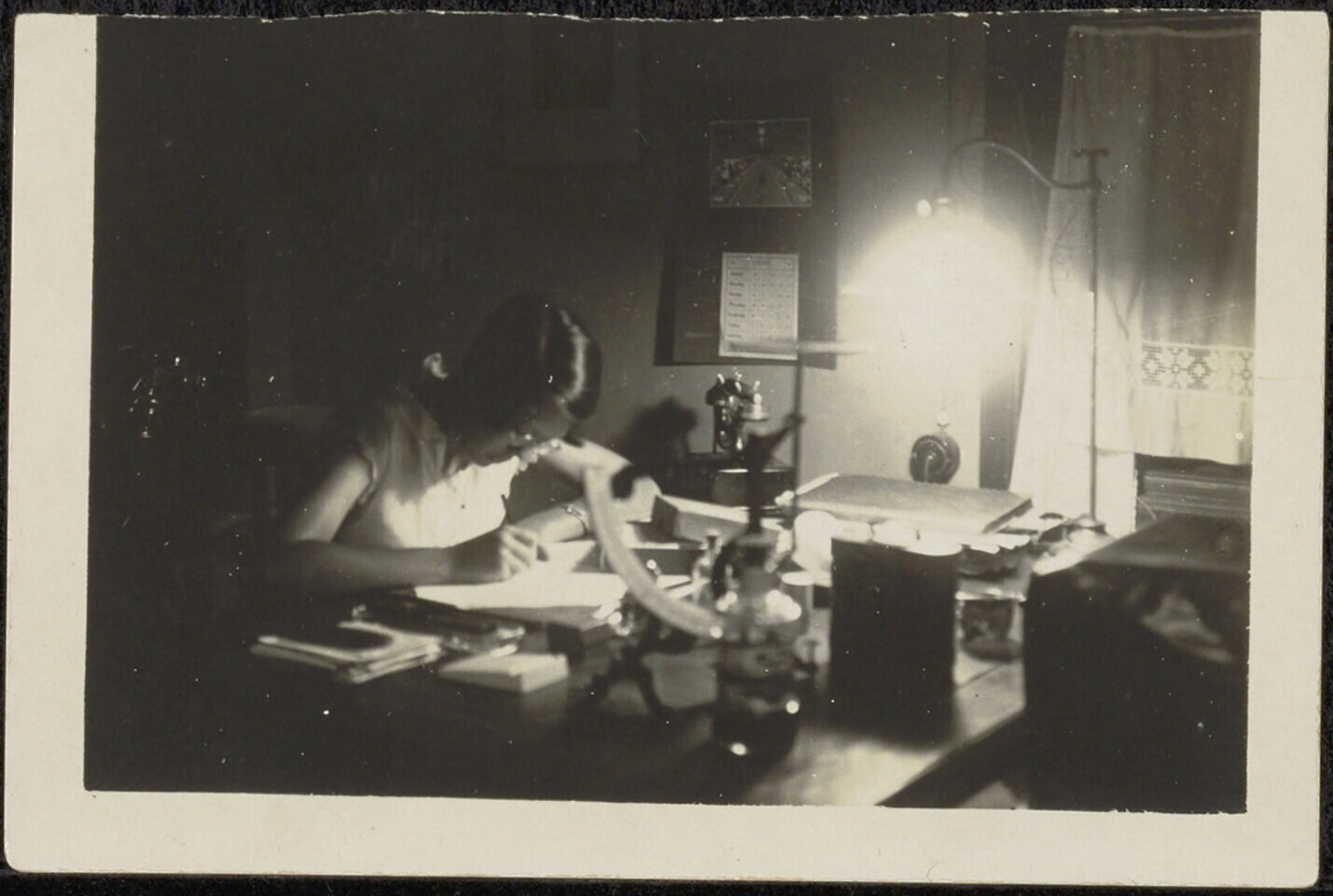 Vrouw die aan een bureau zit te schrijven