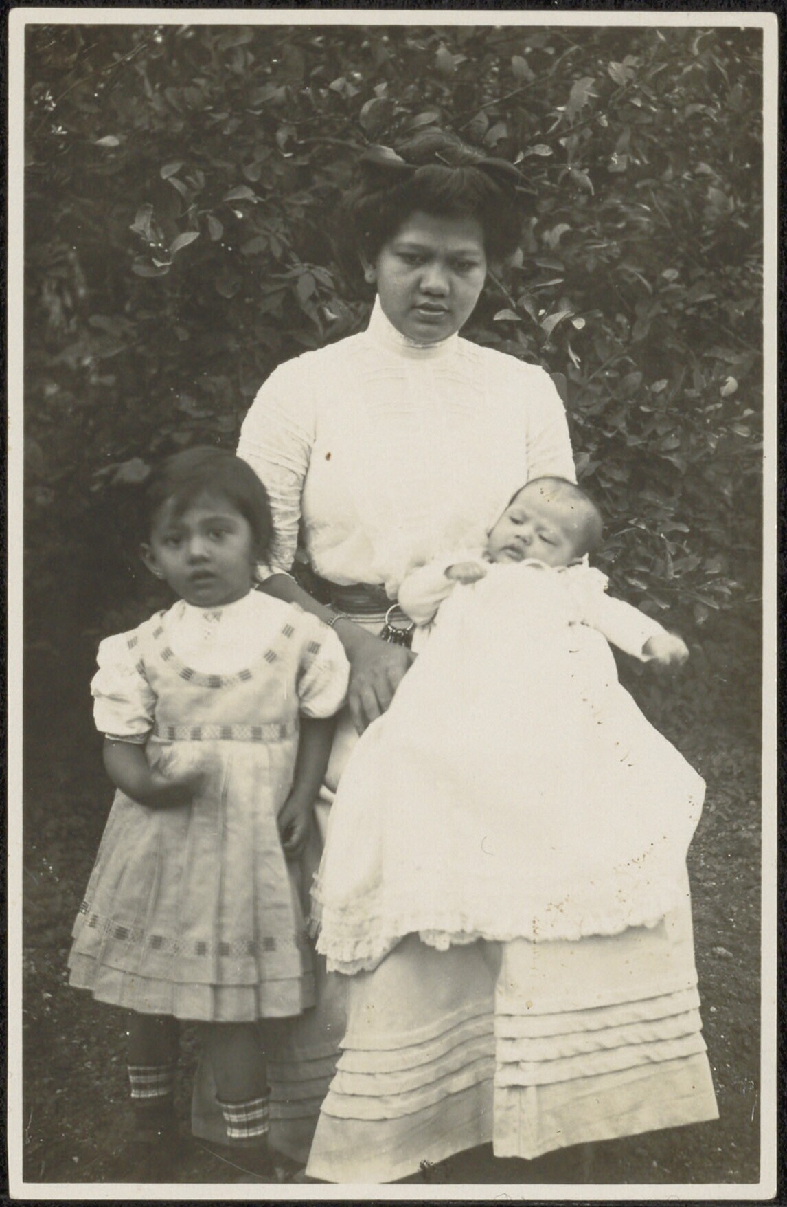 Moeder met haar kinderen, waarvan de baby een doopjurk draagt
