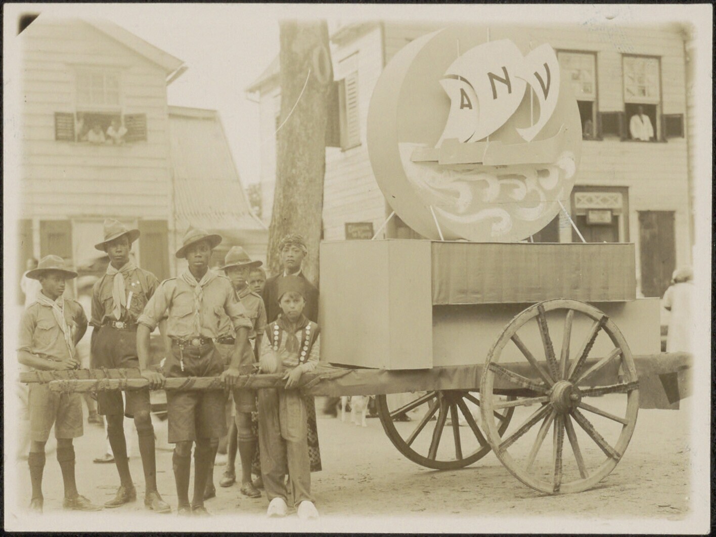 Padvinders lopen met een kar van het Algemeen Nederlands Verbond mee in een optocht