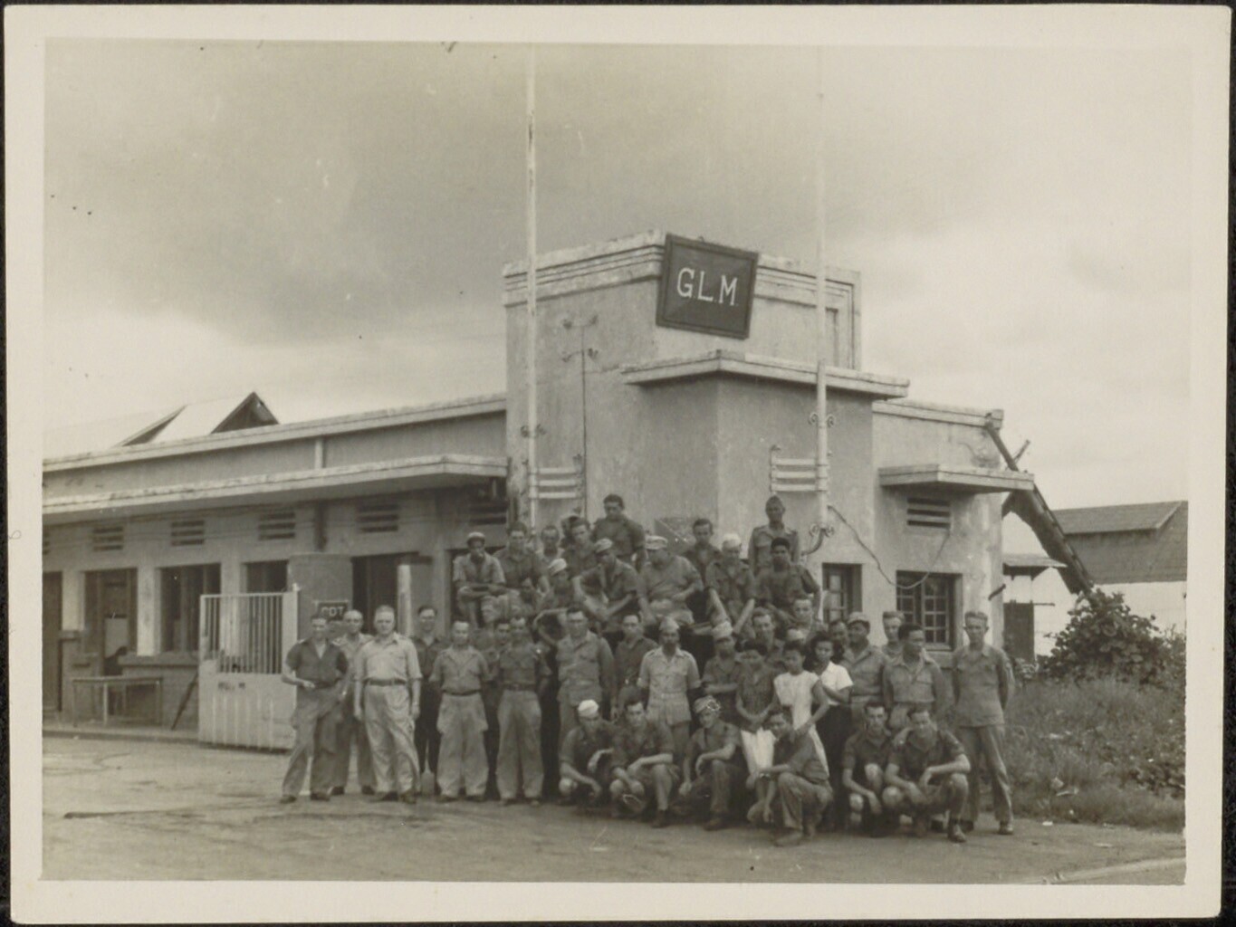 Groepsportret, vermoedelijk van KNIL militairen, voor een gebouw met daarop een bord met de afkorting GLM