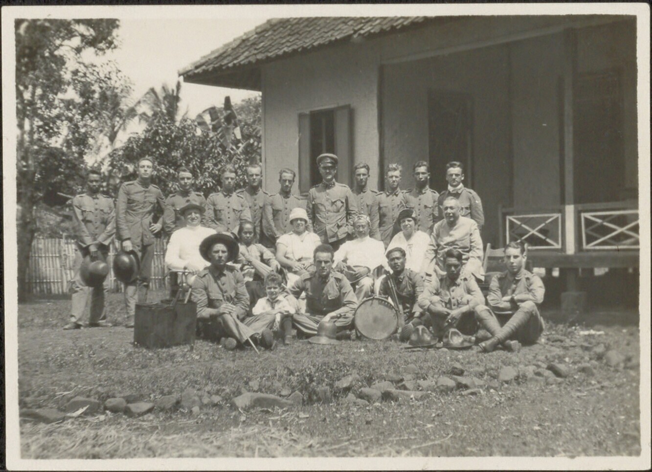 Groepsportret van mensen en militairen van het KNIL voor een woonhuis