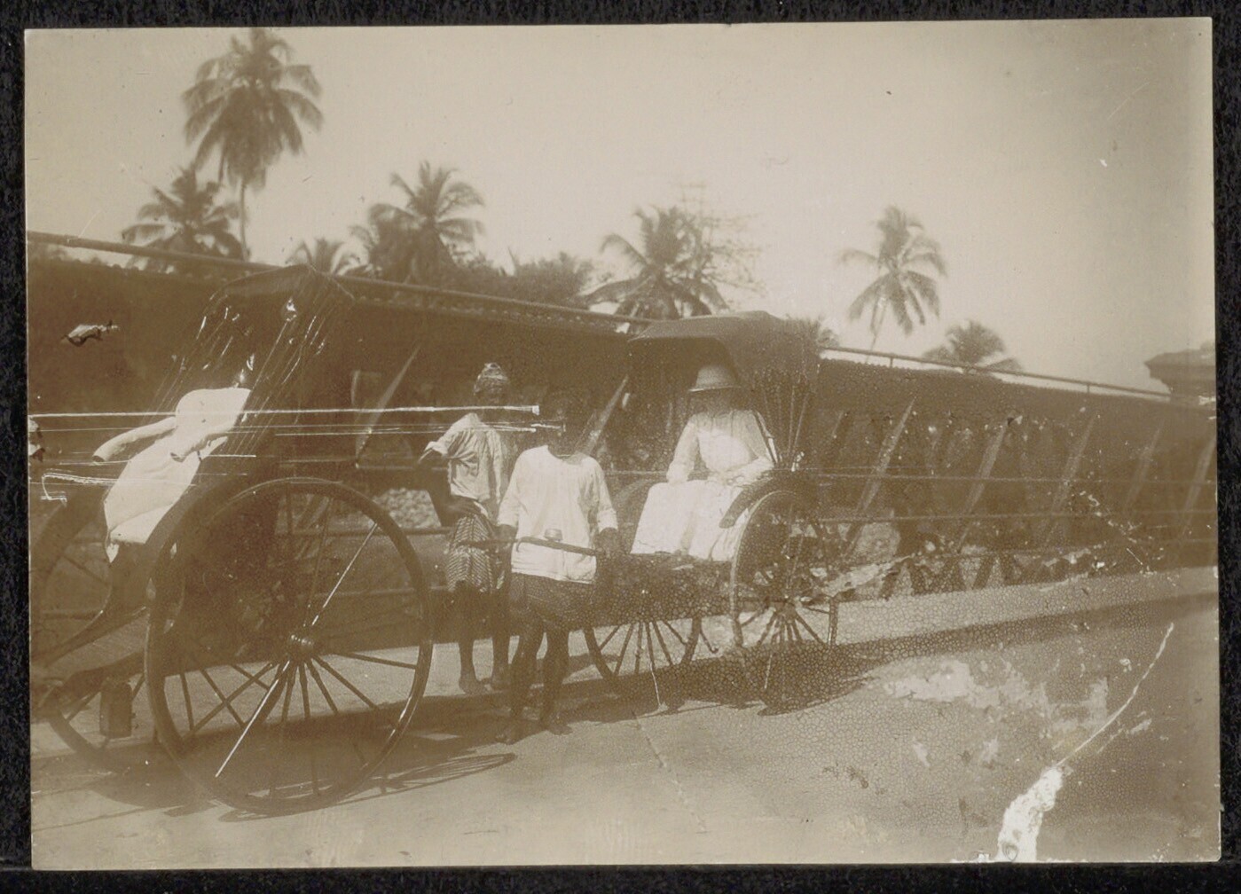 Vrouw in een rikshaw welke wordt door een man te voet wordt getrokken