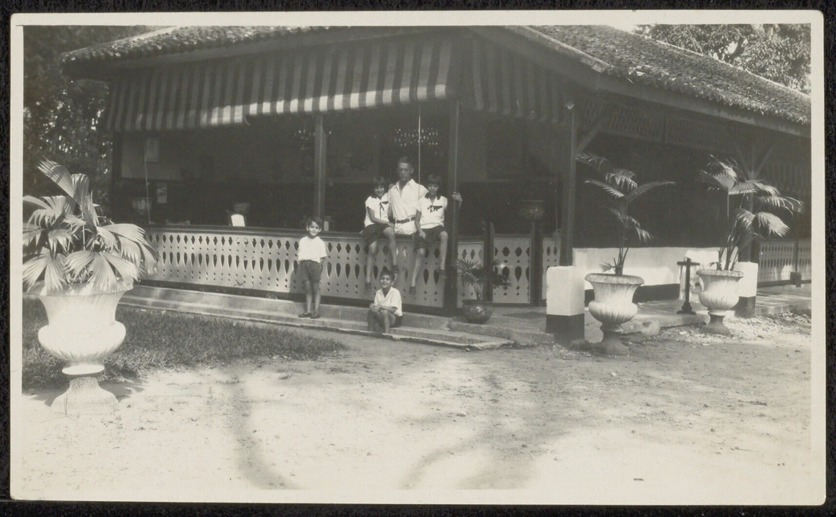 Portret van een man en vier kinderen op de galerij van een huis