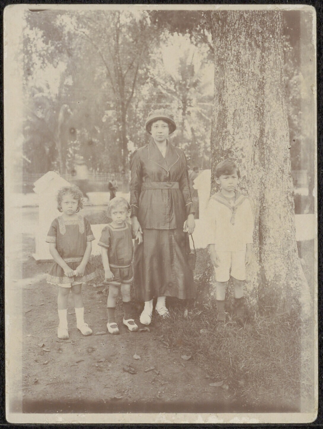 Portret van een moeder met haar kinderen bij een boom