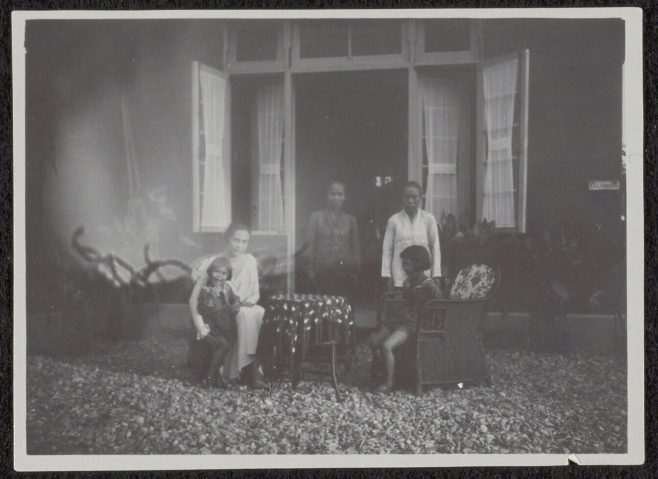 Portret van een moeder met haar dochters en de kinderverzorgster