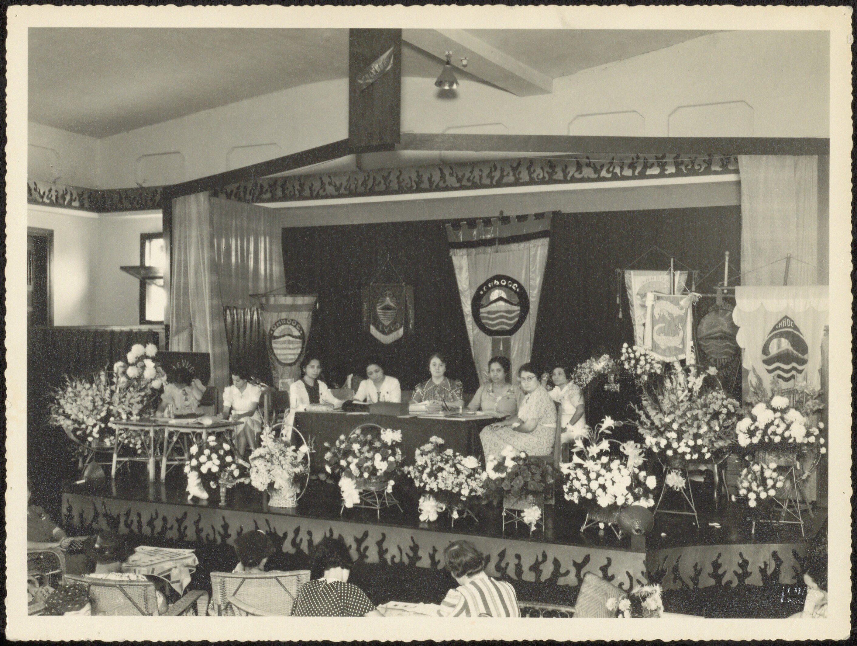 Mensen op een podium, zittend achter een tafel, tijdens een congres