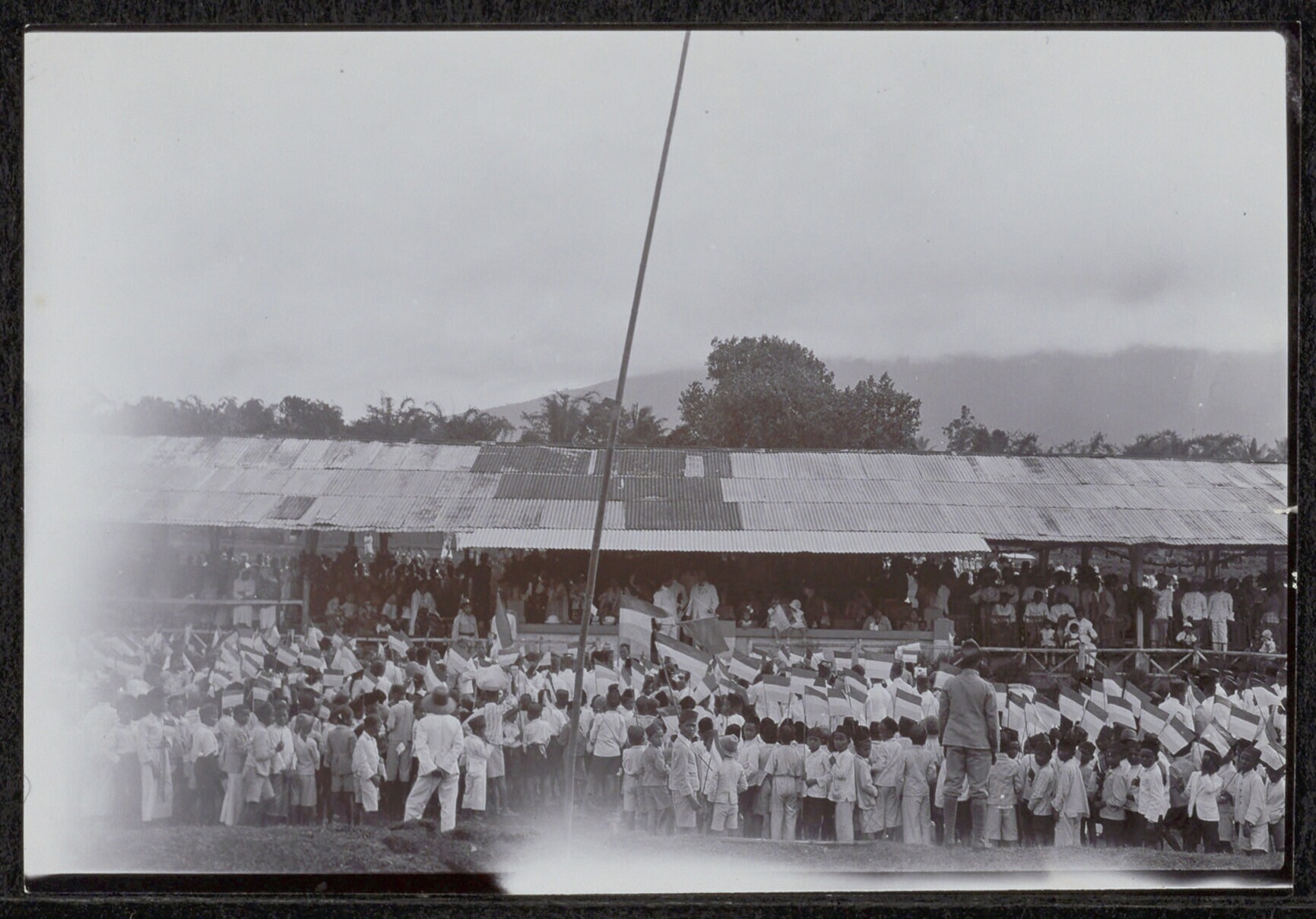 Een groep kinderen met Nederlandse vlaggen staan bij een paviljoen tijdens een festiviteit
