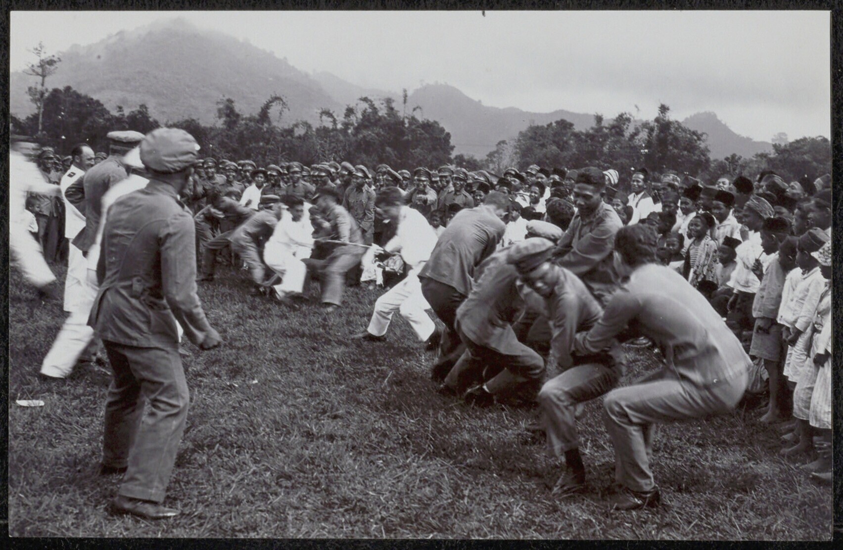Mensen, waaronder een grote groep militairen, kijken naar mannen die aan het touwtrekken zijn