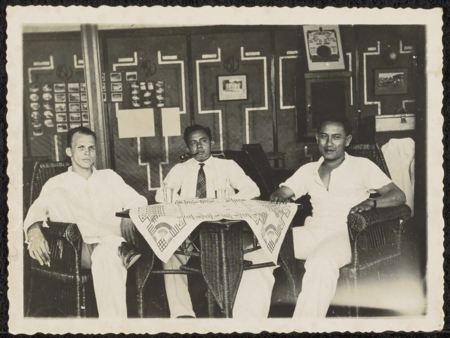 Portret van drie mannen, zittend aan een tafel