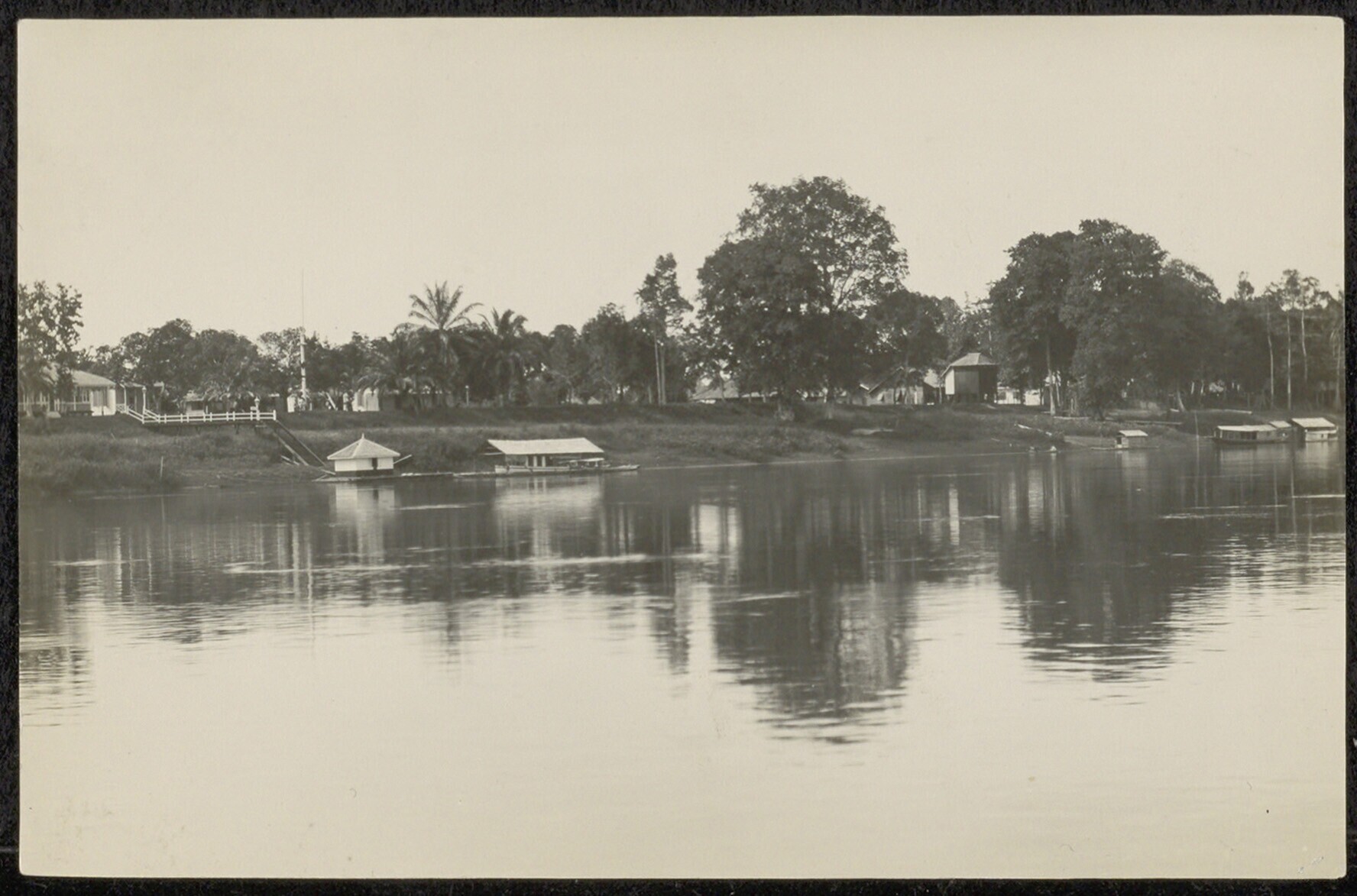 Gezicht op een rivier met bebouwing op de oever