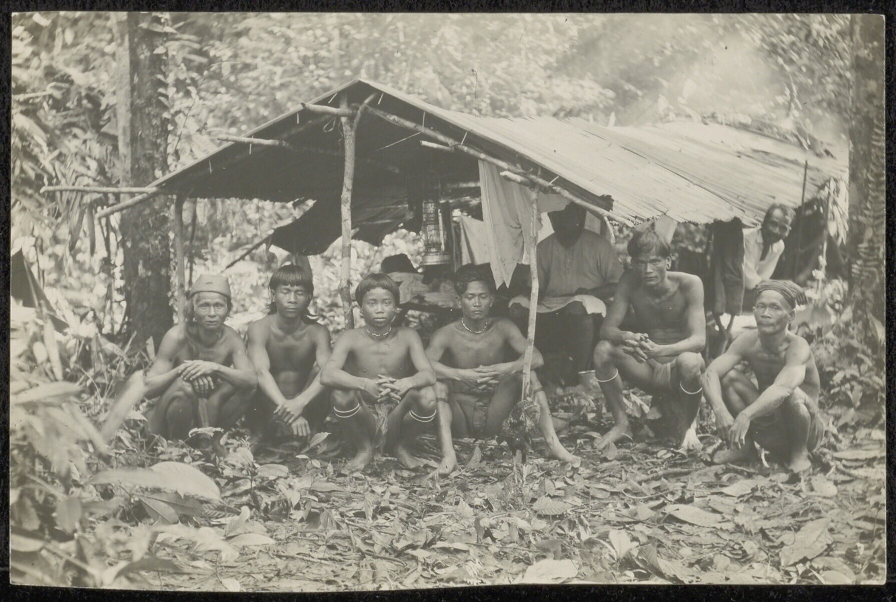 Groepsportret van Dayak mannen die mee zijn op een Nederlandse expeditie