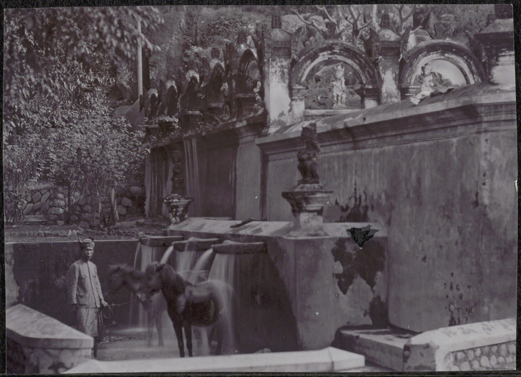 Een man met een pony bij een wasplaats, vermoedelijk bij een tempelcomplex