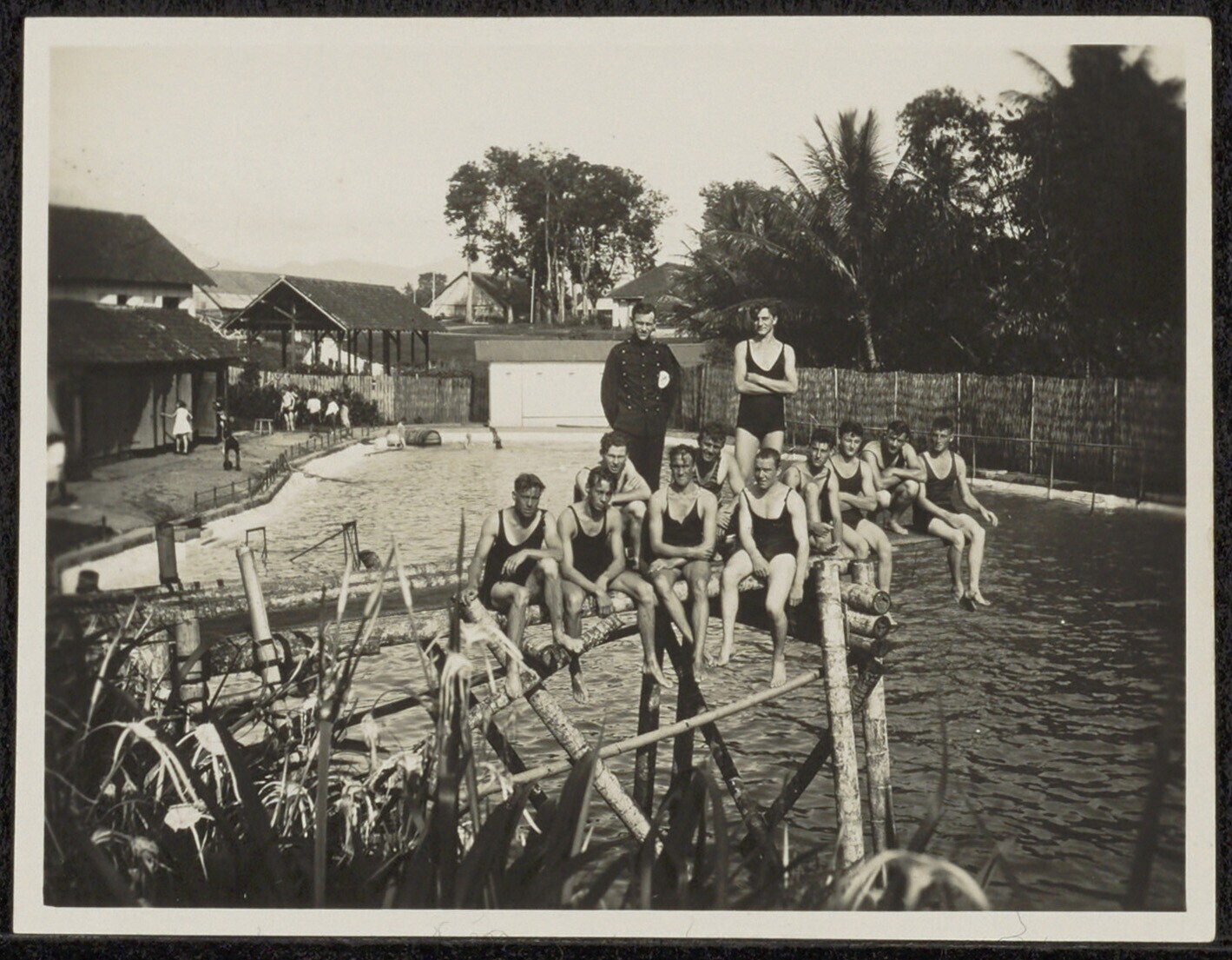 Portret van een groep mannen in badkleding bij een zwembad