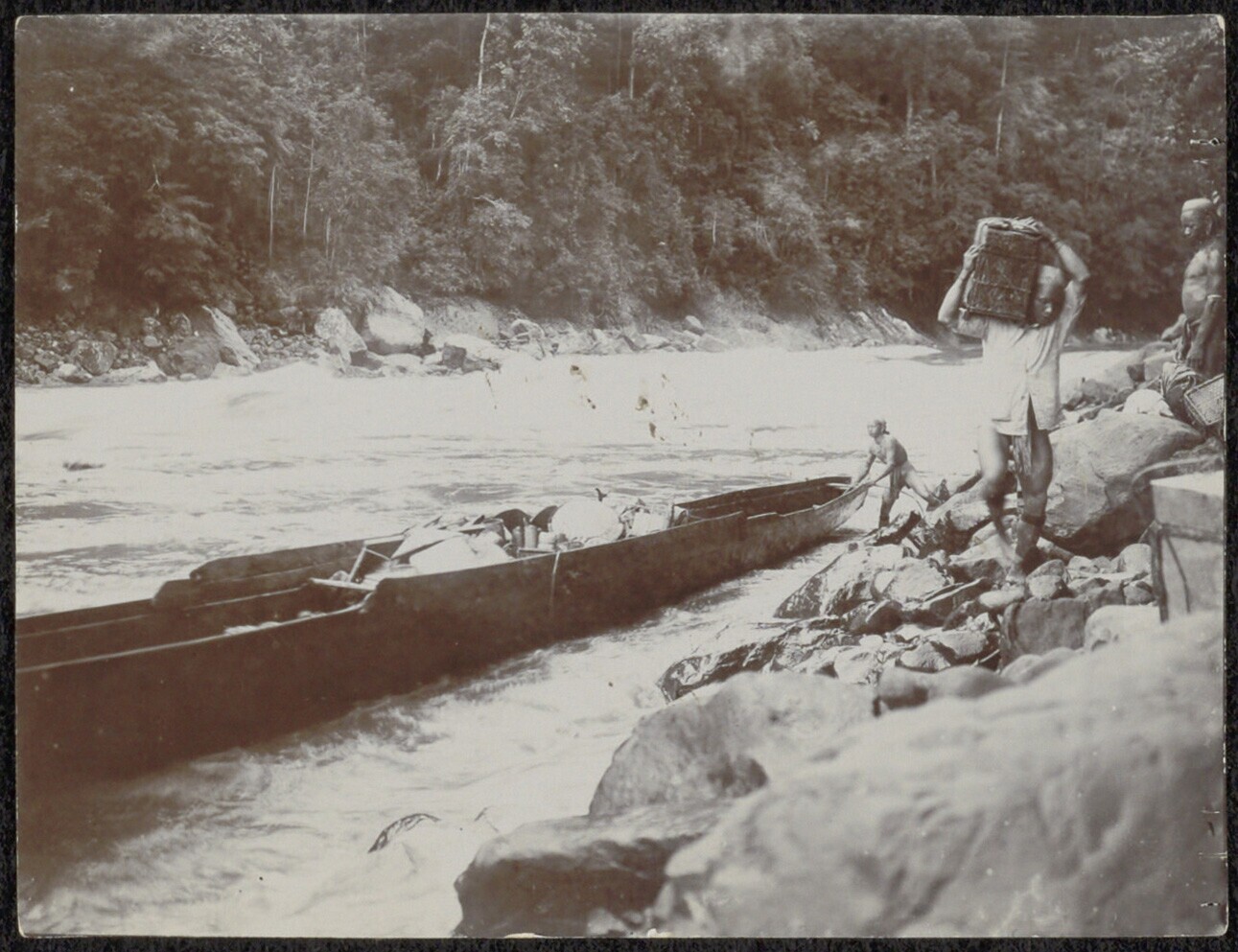 Bagage wordt bij een stroomversnelling in de rivier uit een prauw geladen