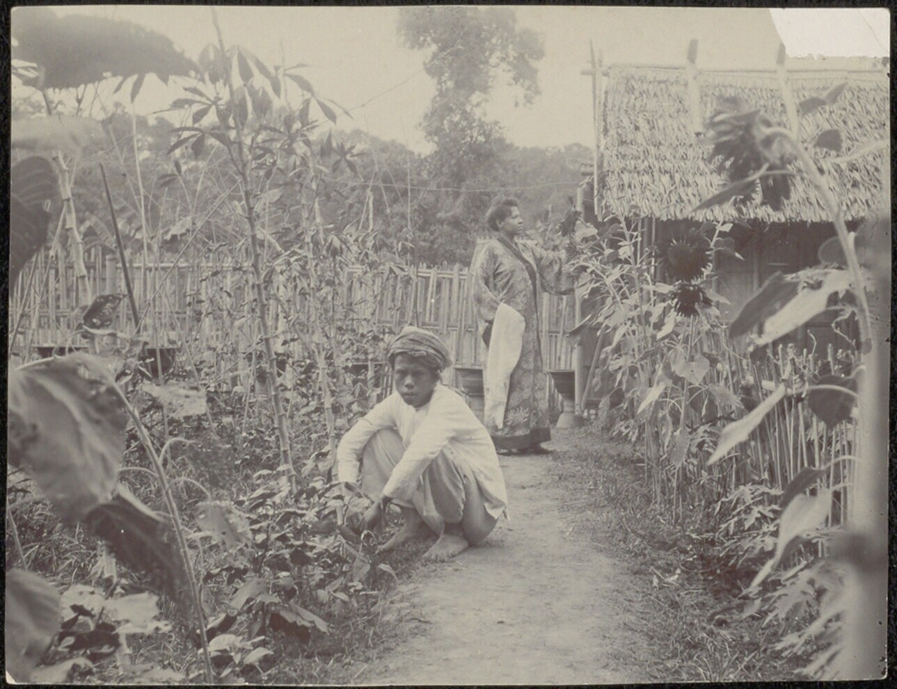 Tuin, met op de voorgrond een gehurkte jongen en op de achtergrond een vrouw