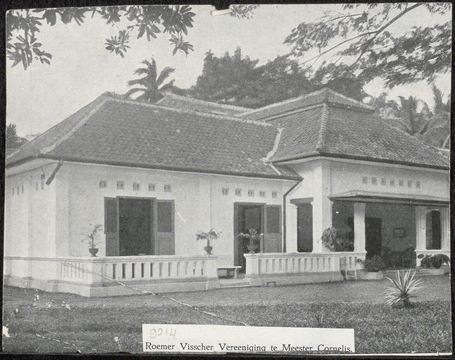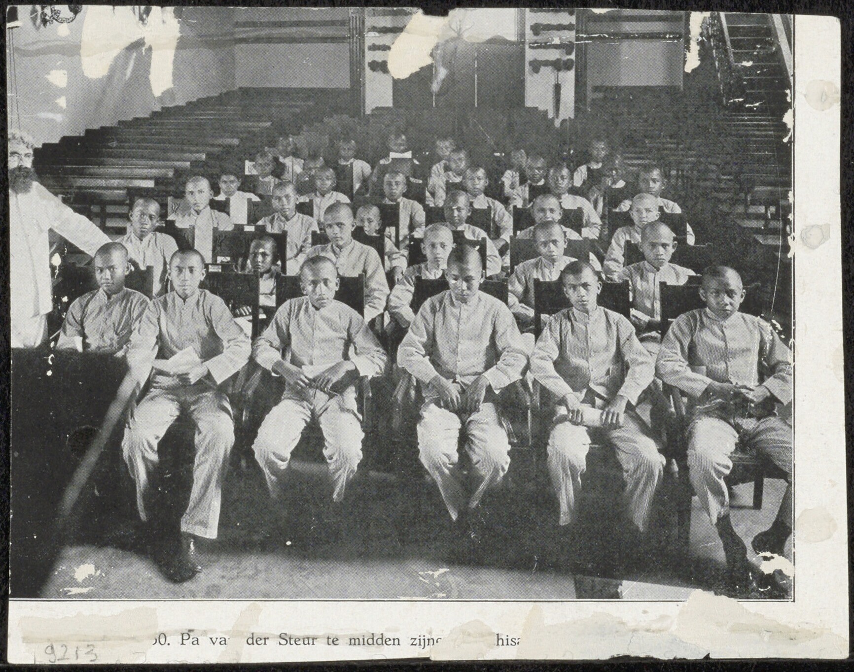 Groepsportret van jongens en een man in een zaal vol stoelen
