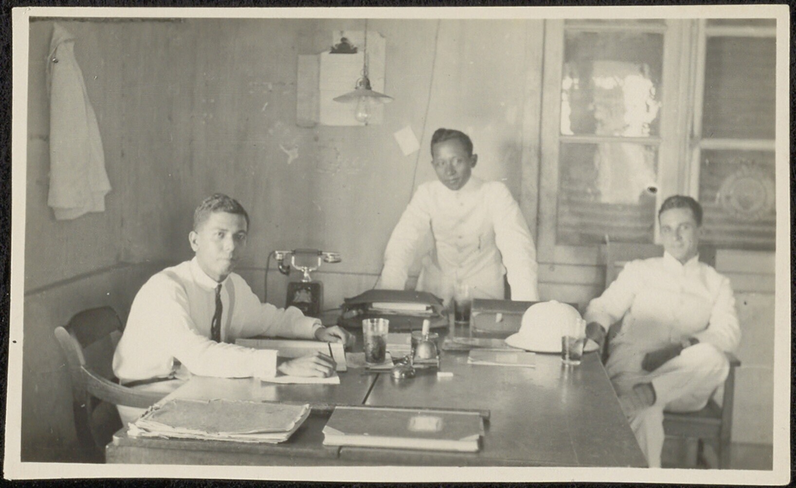 Portret van drie mannen aan een bureau