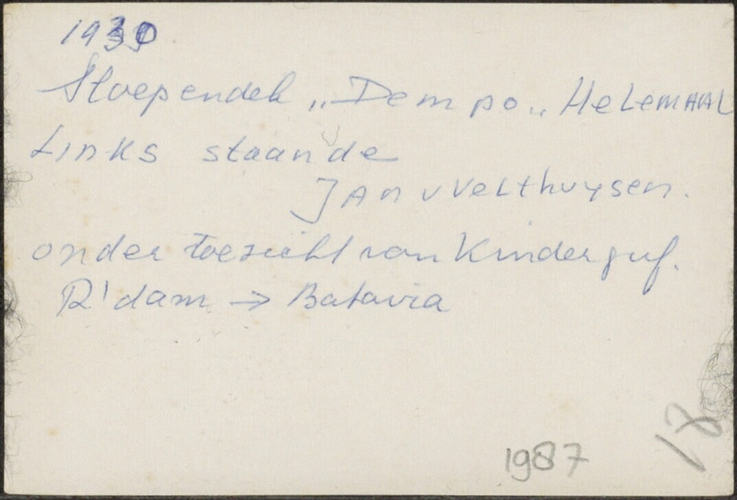 Groepsportret op het sloependek van motorschip Dempo, onderweg van Rotterdam naar Batavia