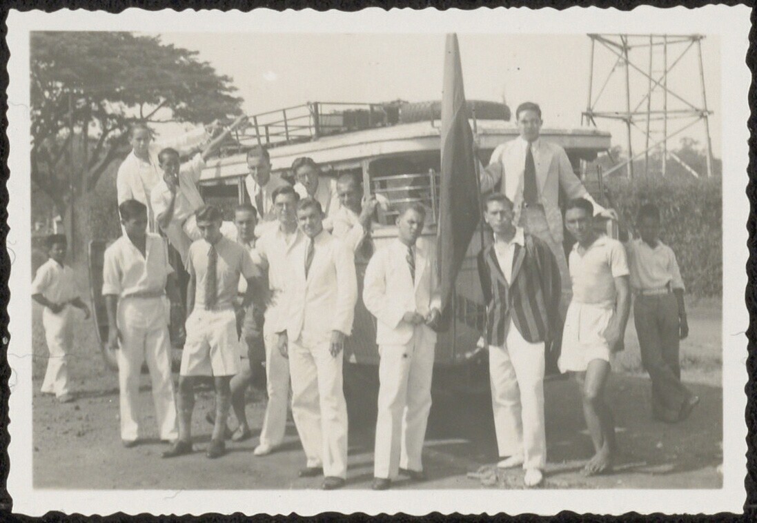 Groepsportret leden van een vereniging bij een autobus