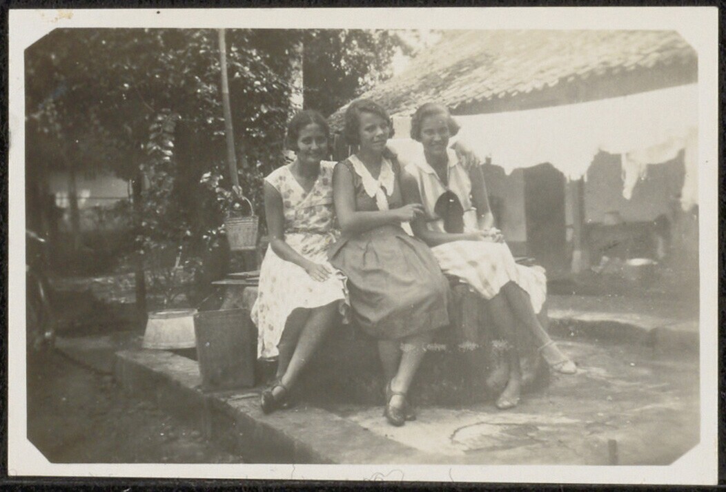 Drie vrouwen bij waterput op het achtererf