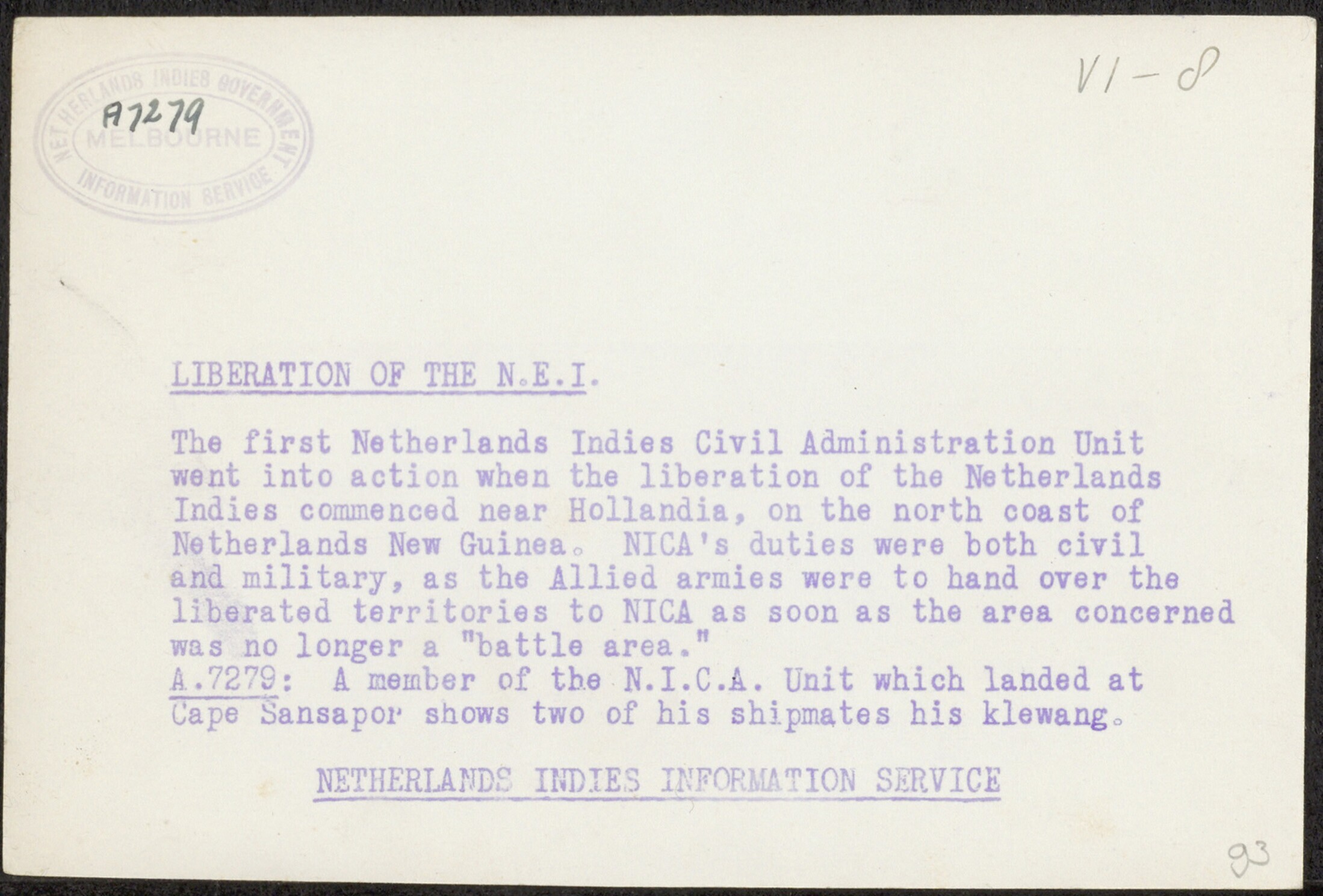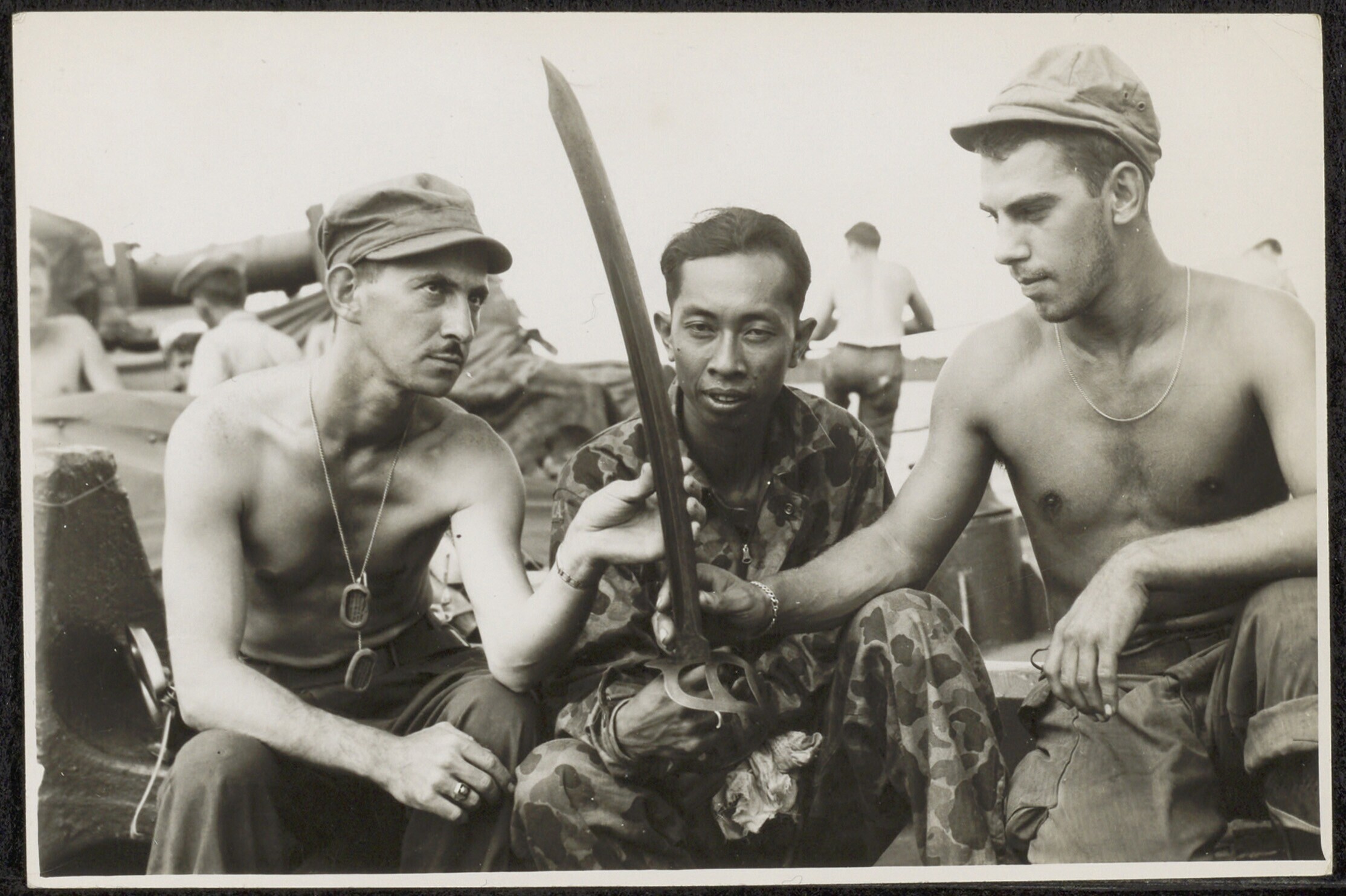 NICA militairen bewonderen een klewang na de landing in Sansapor Baai