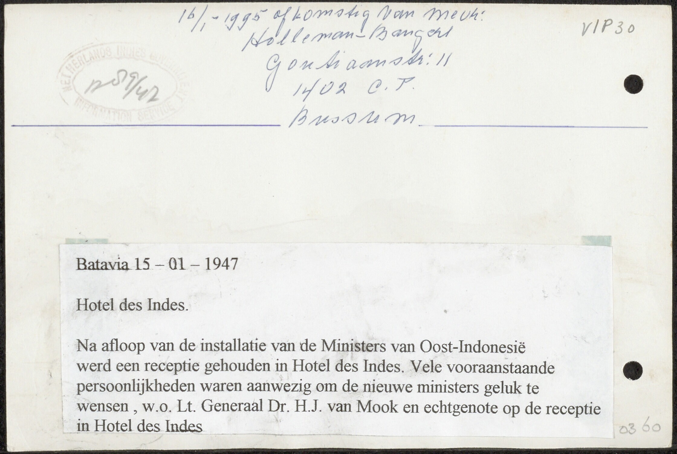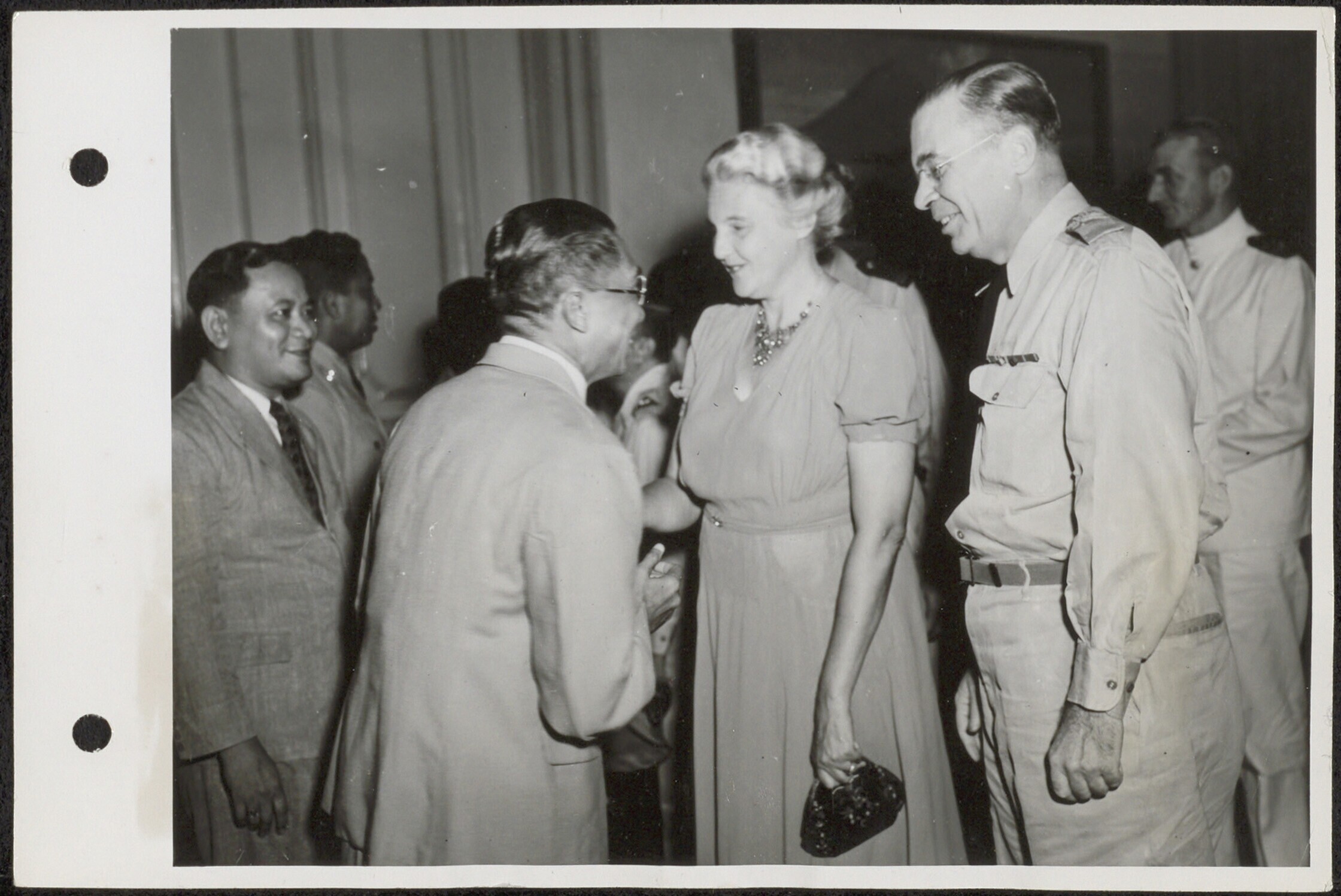 Luitenant-gouverneur-generaal H.J. van Mook met zijn echtgenote op de receptie in Hotel des Indes na afloop van de installatie van de ministers van Oost-Indonesië
