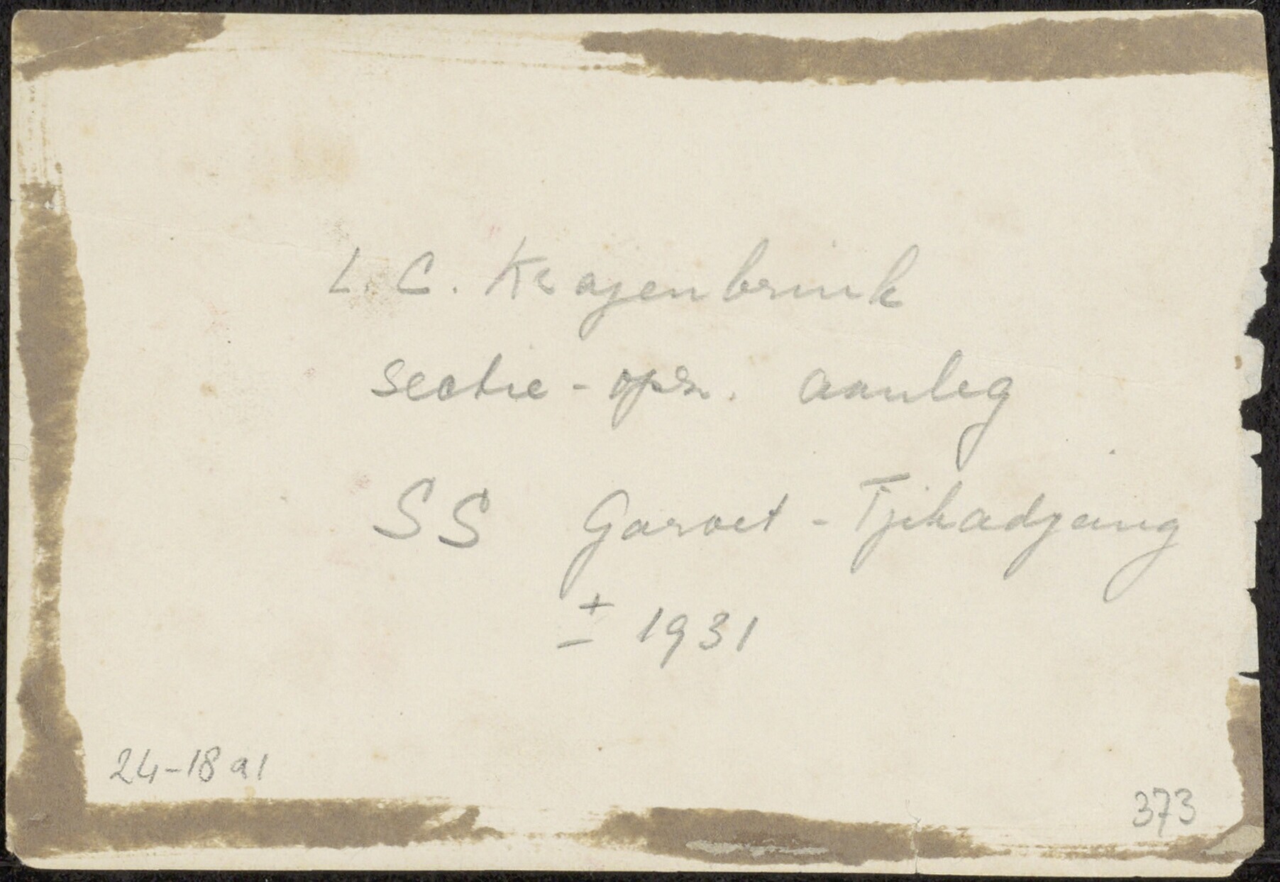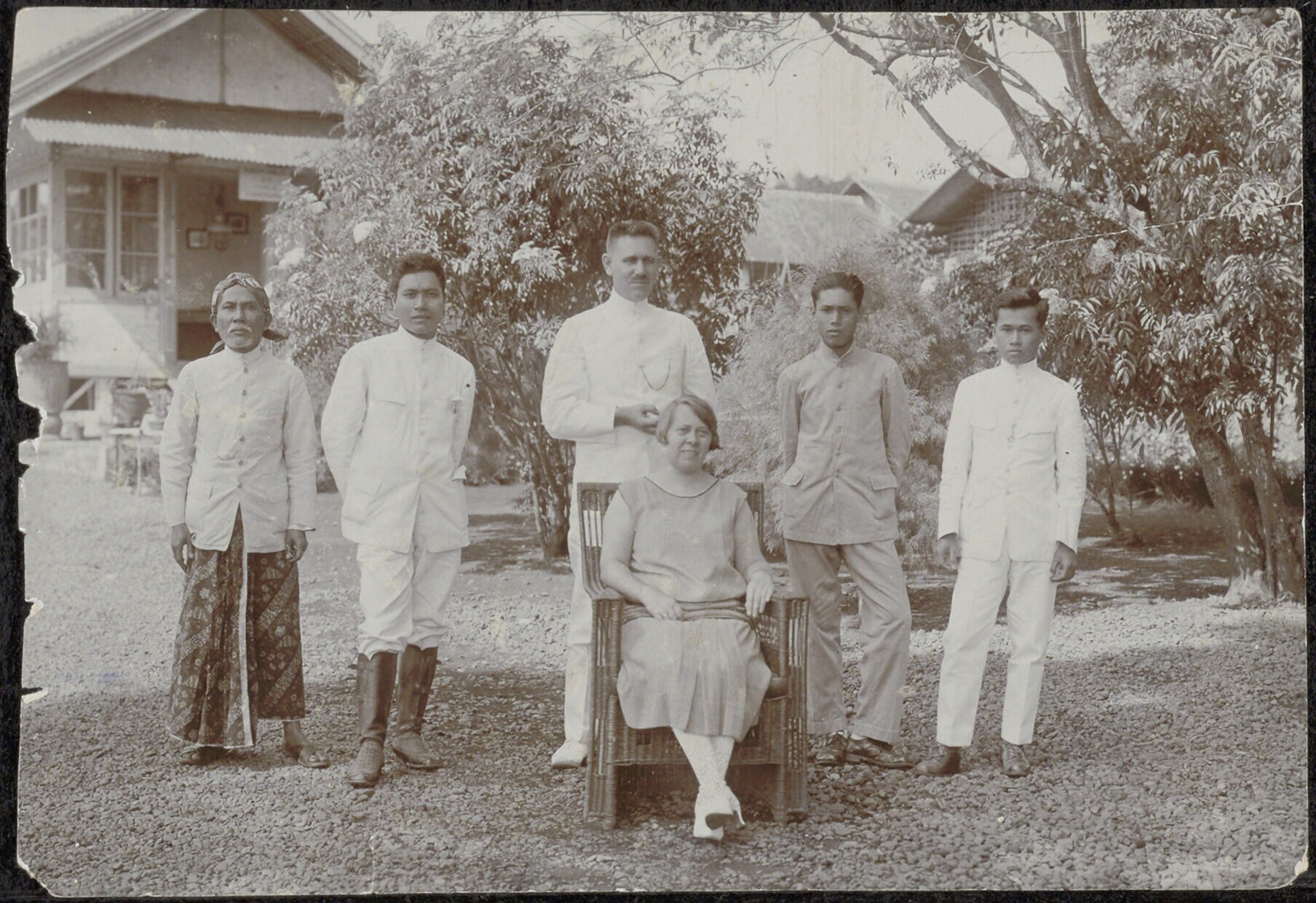 Groepsportret in de tuin, met sectie-opzichter L.C. Krajenbrink van de Staatsspoorwegen, tijdens de aanleg van de spoorlijn Garoet-Tjikadjang