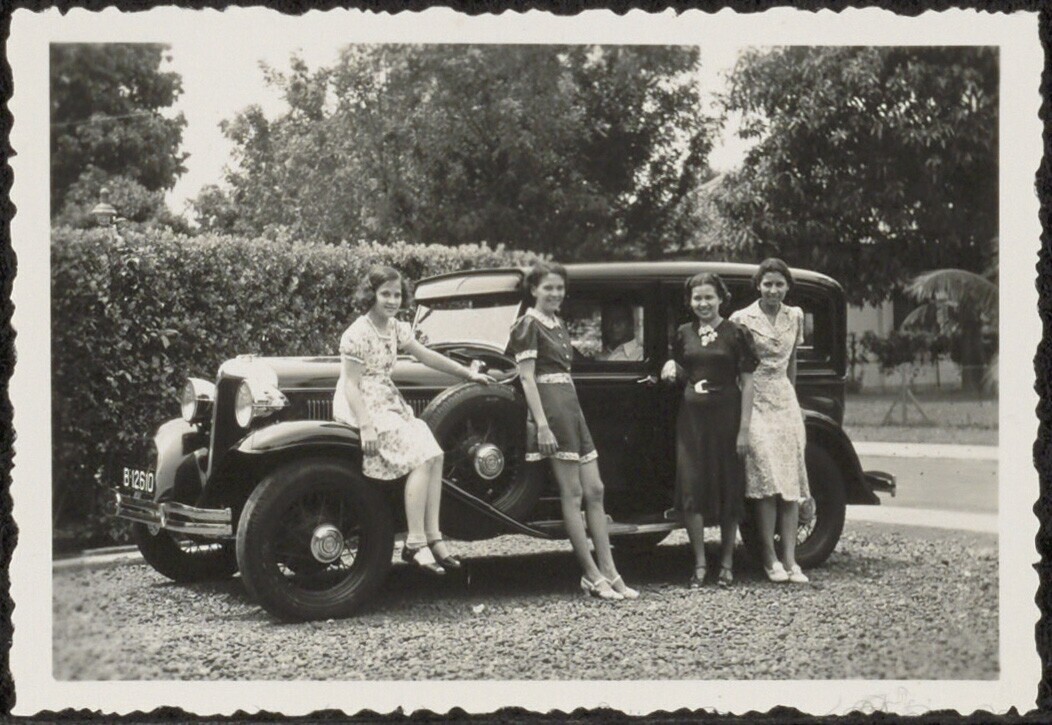 Groepsportret jonge vrouwen bij auto, Batavia