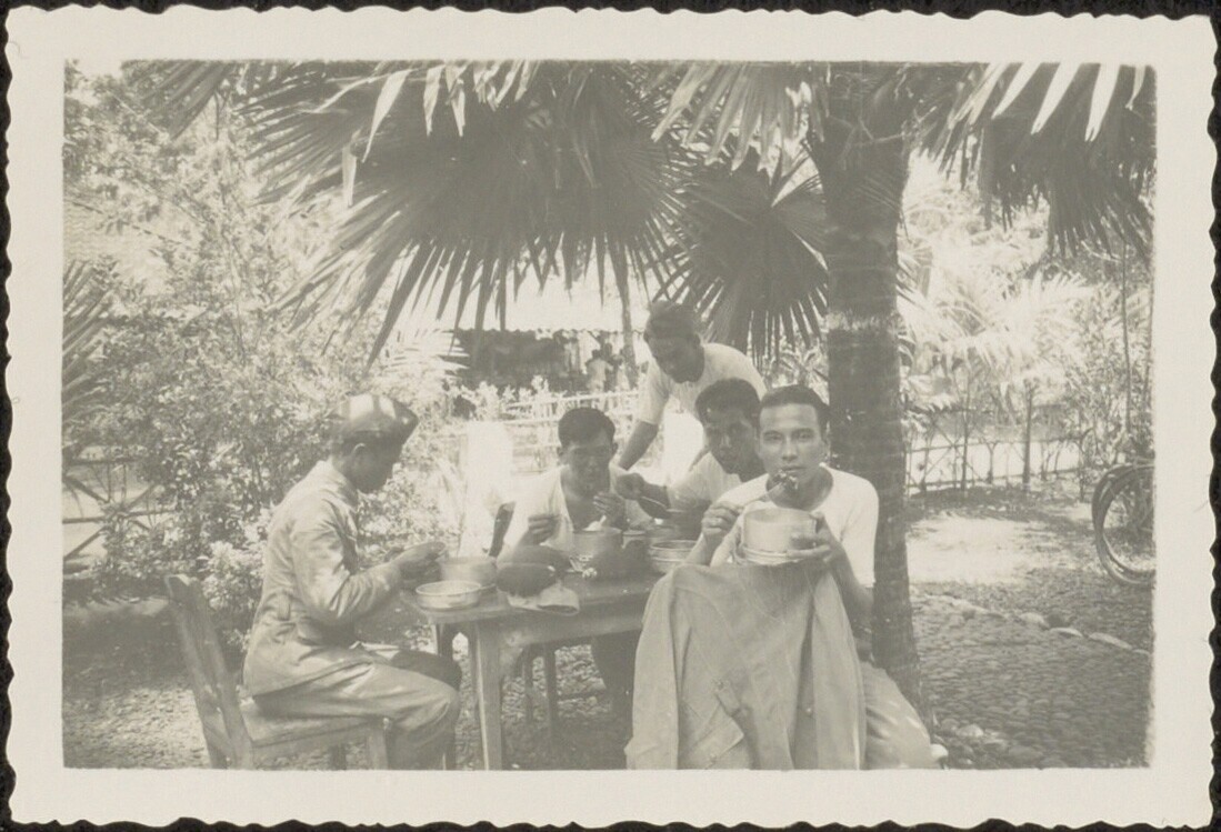 Militairen of veldpolitie (?) tijdens een maaltijd