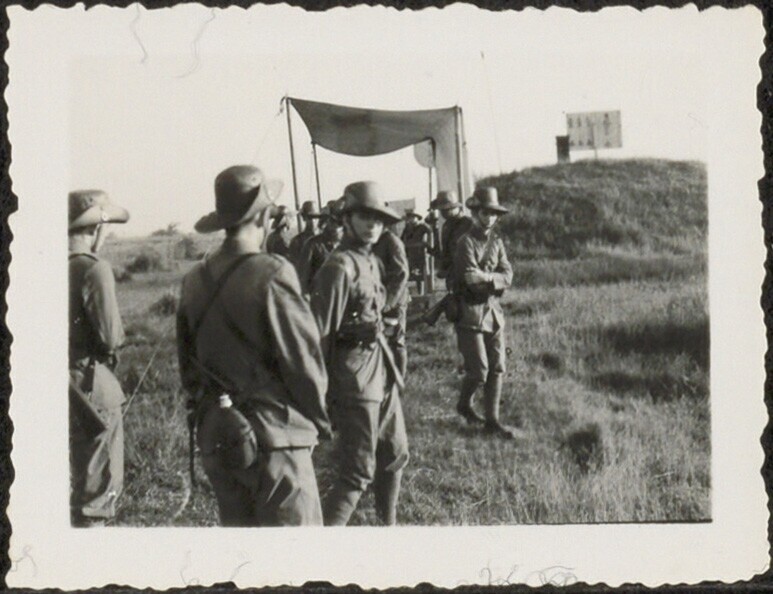 Veldpolitie of militairen (?) tijdens schietoefeningen