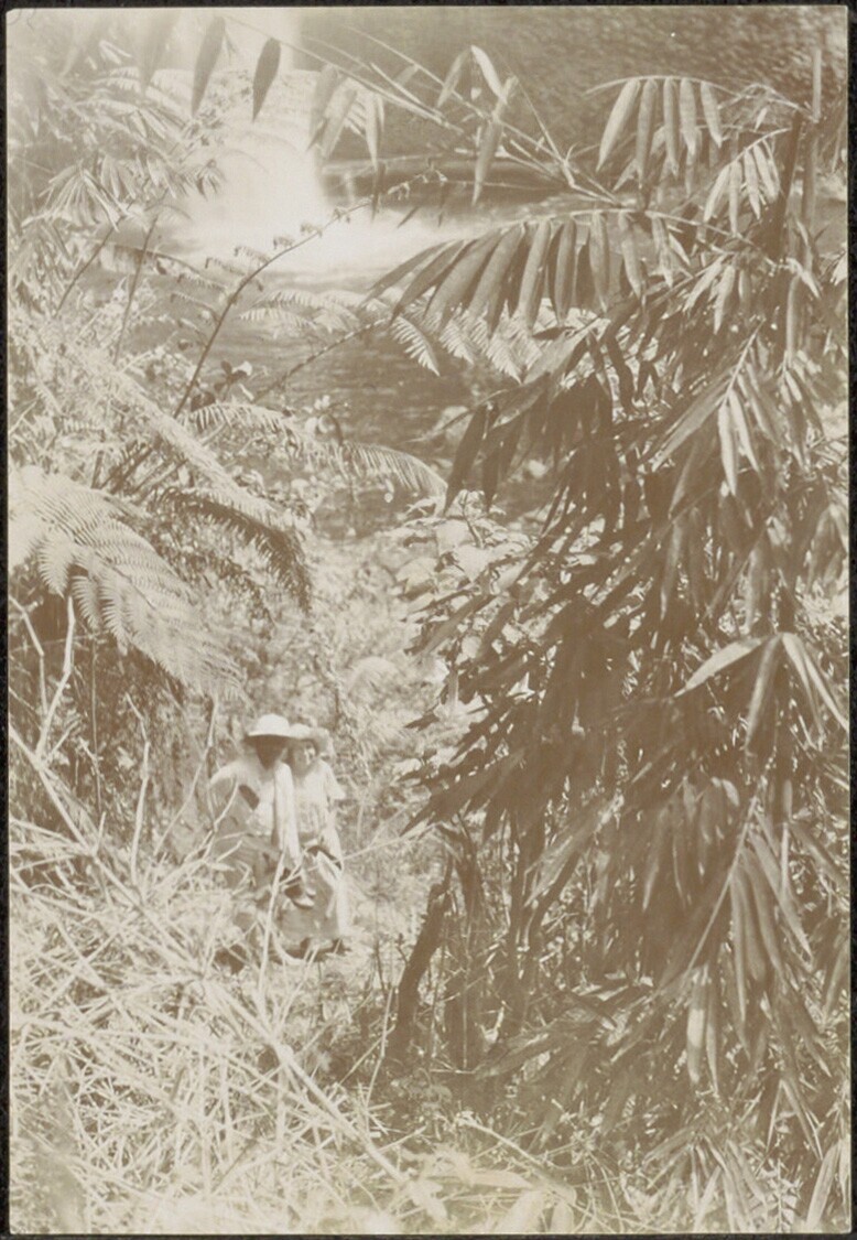 Portret van een twee mensen aan de met planten begroeide oever van een rivier