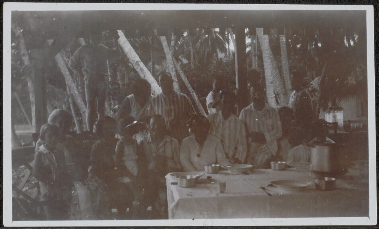 Groepsportret bij een gedekte tafel