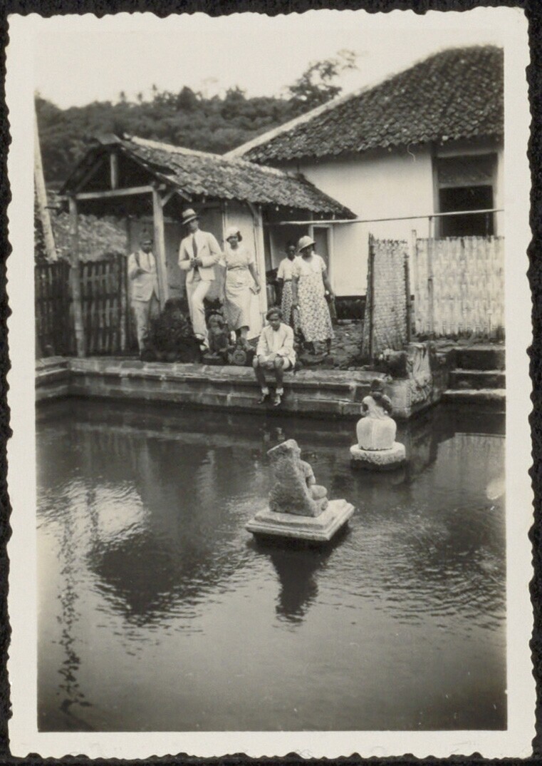 Portret van een groep mensen in een tuin aan het water