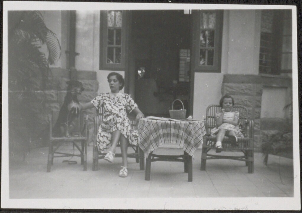Nineke, Lieke en de hond 'Tobias', zittend voor hun huis op Darmokali 58