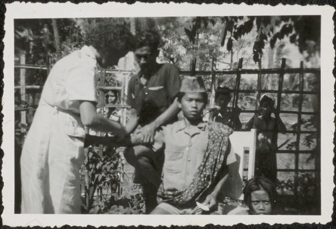 Een verpleegkundige voert een medische handeling bij een militair