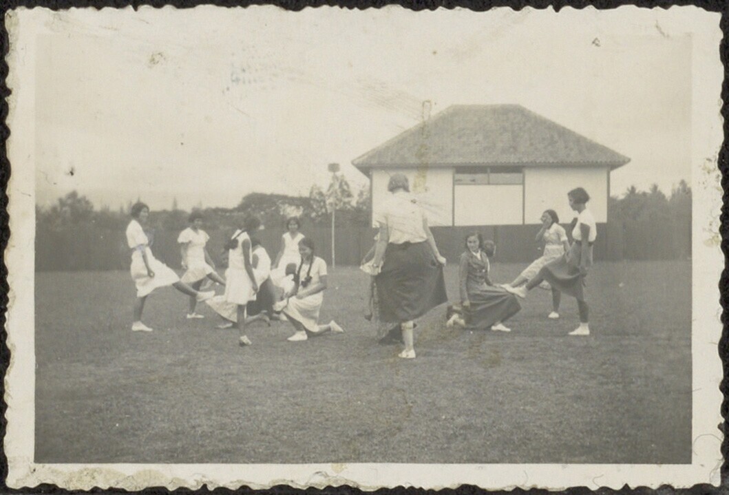 Groep vrouwen, vermoedelijk bezig met een gymnastiekoefening