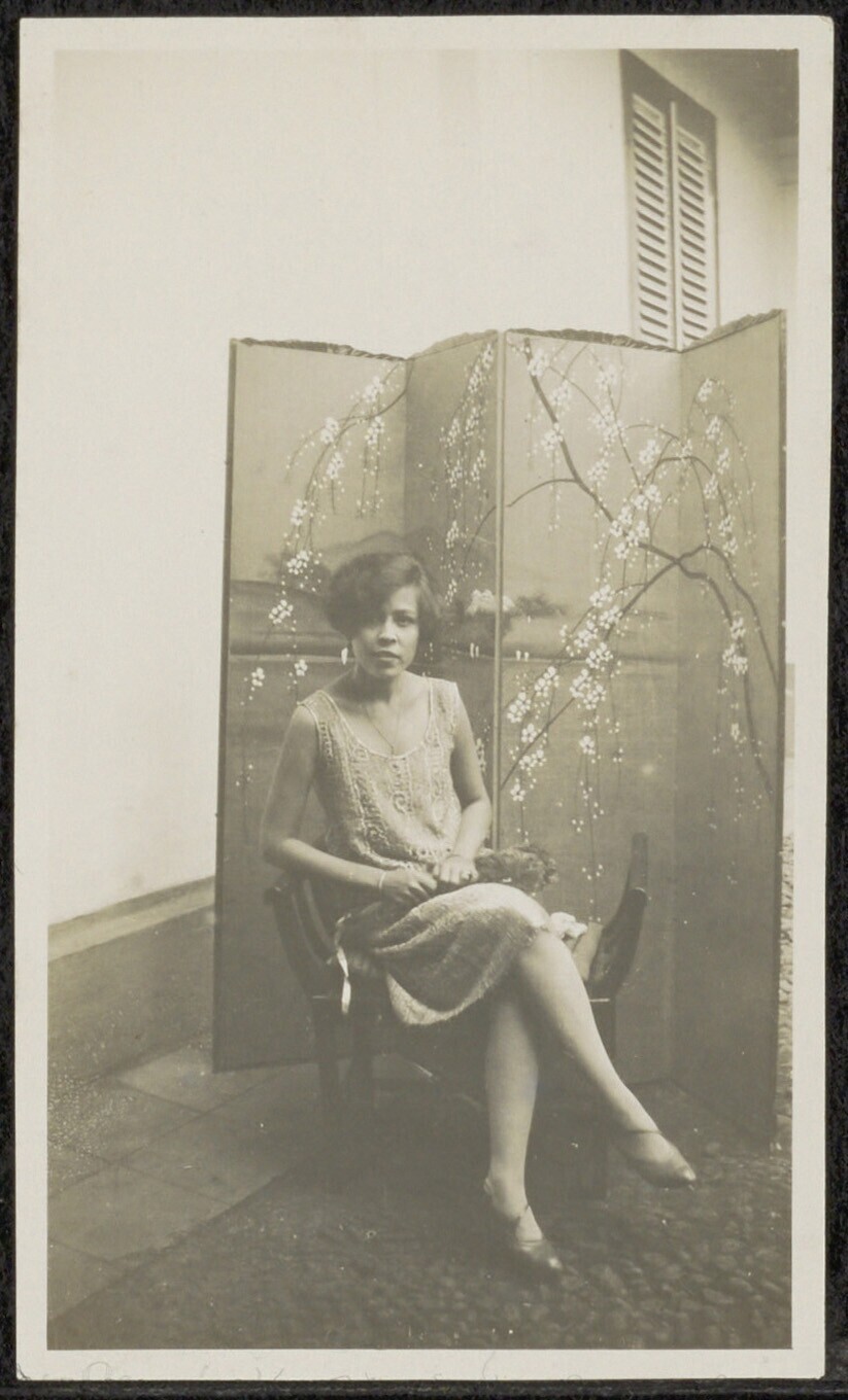 Portret van een jonge vrouw voor een kamerscherm