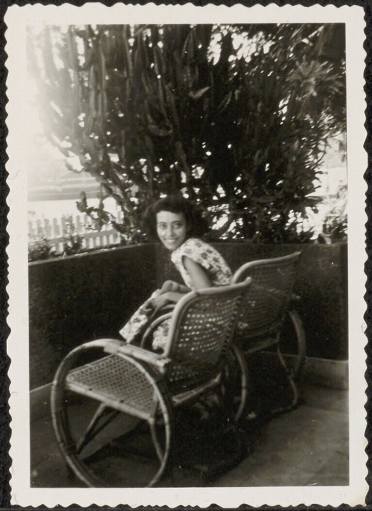 Portret van een jonge vrouw in een tuinstoel