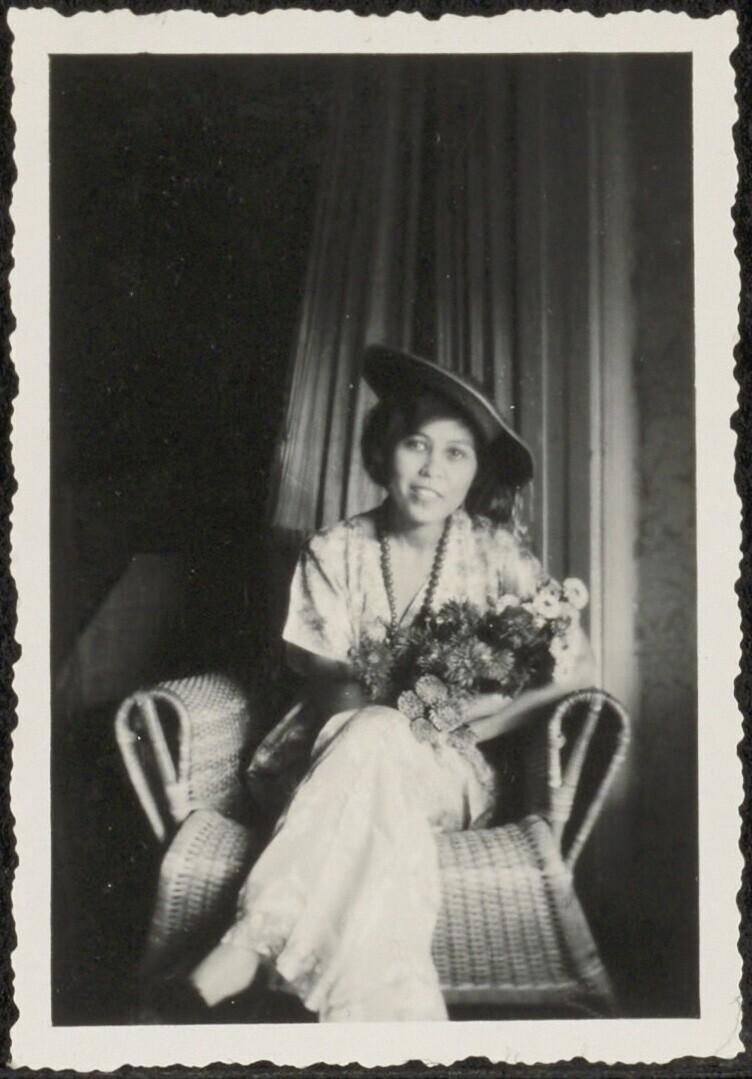 Portret van een jonge vrouw, zittend in een stoel met een boeket bloemen
