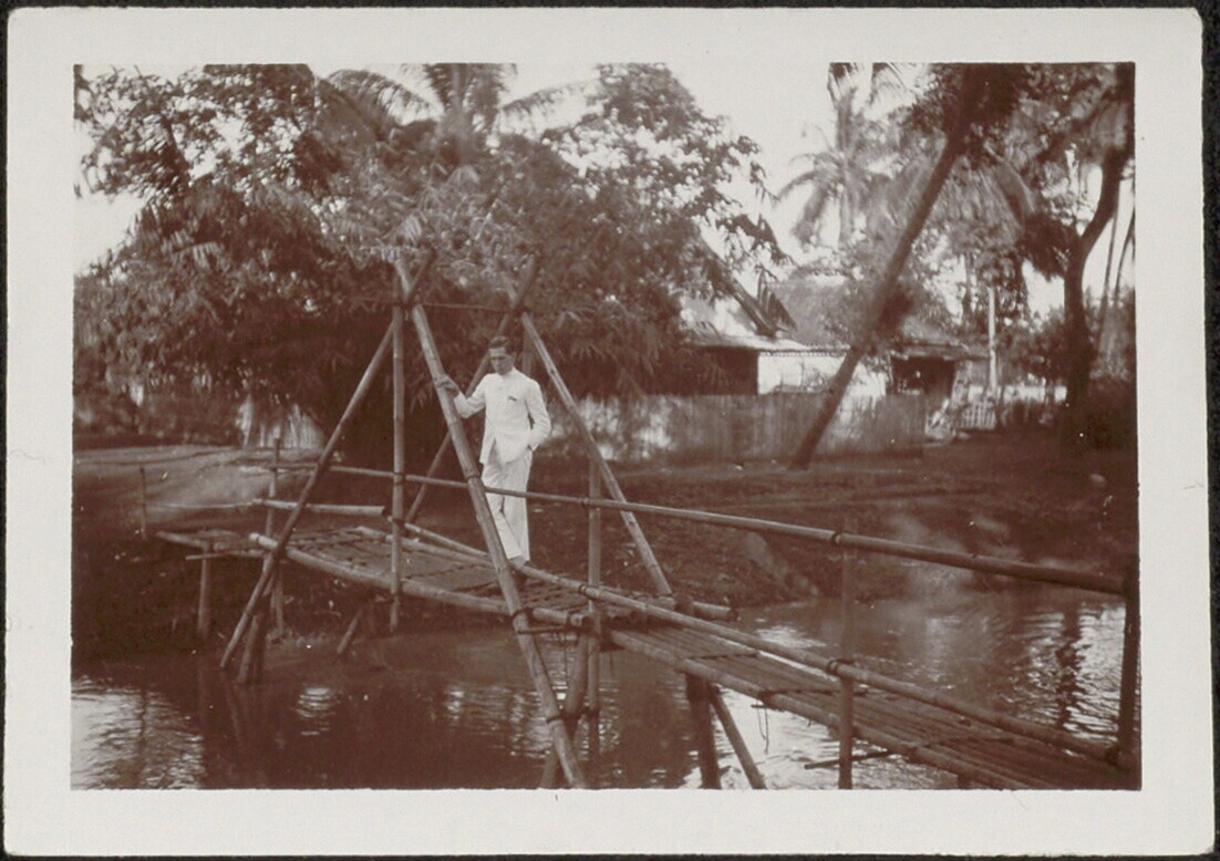 Een man, staand op een brug van bamboe, bij de Kebon Sirih te Batavia