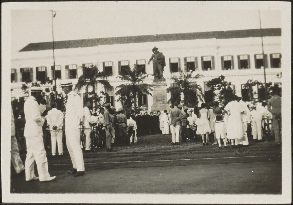 Kranslegging aan het standbeeld van Gouverneur-Generaal Jan Pieterszoon Coen, de stichter van Batavia, ter gelegenheid van de herdenking van zijn honderste sterfdag te Weltevreden