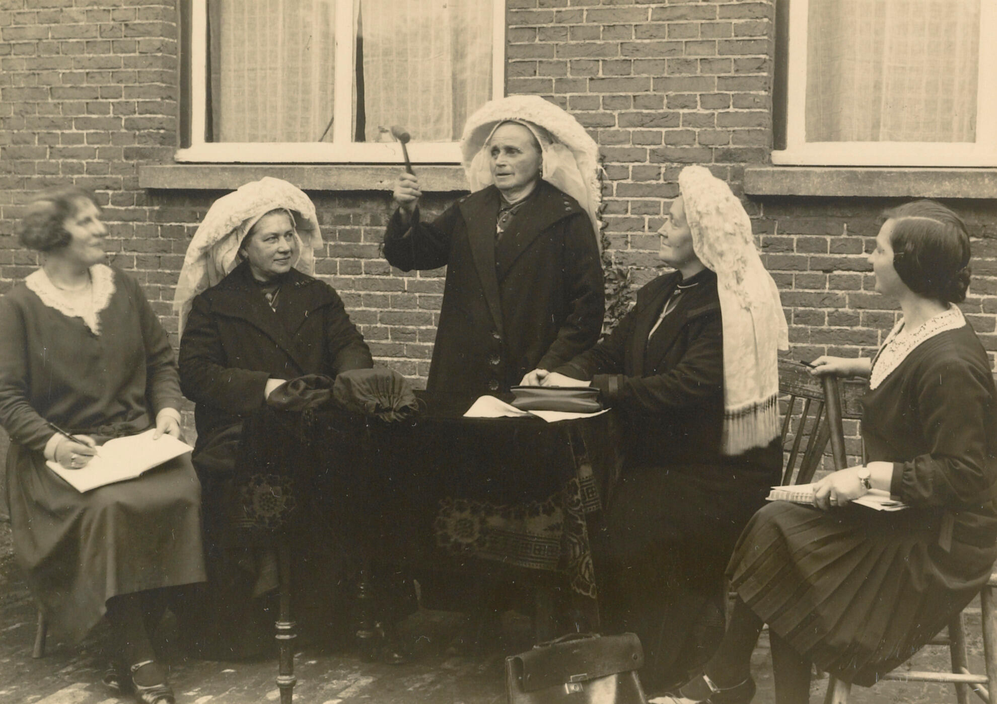 Drie vrouwen in streekdracht uit Boxtel. Over de muts dragen ze een poffer. Twee vrouwen in burger met notitieblokken op schoot kijken toe.