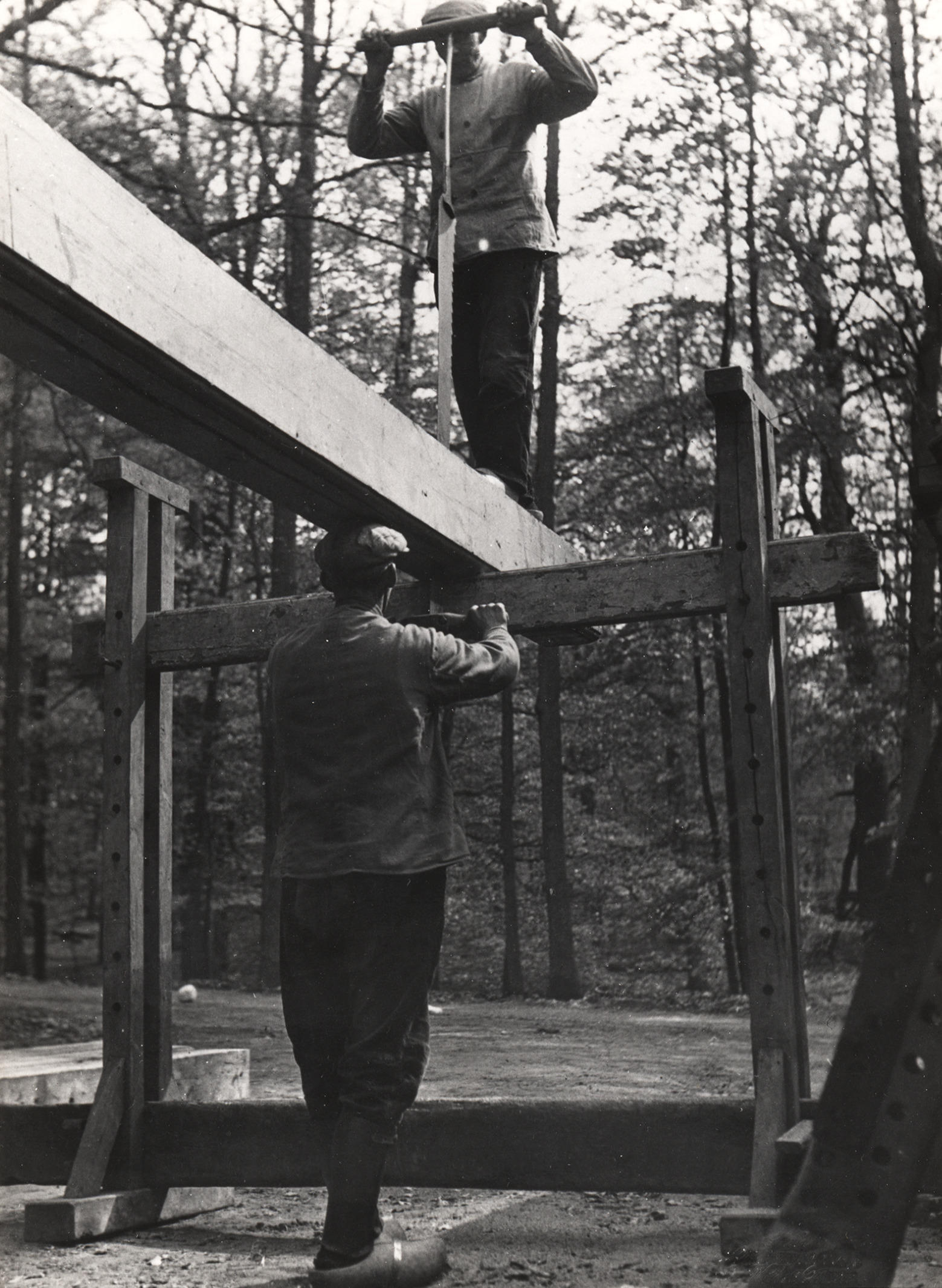 Zagen met een kraanzaag, Nederlands Openluchtmuseum, 1944 (zwart-wit foto)