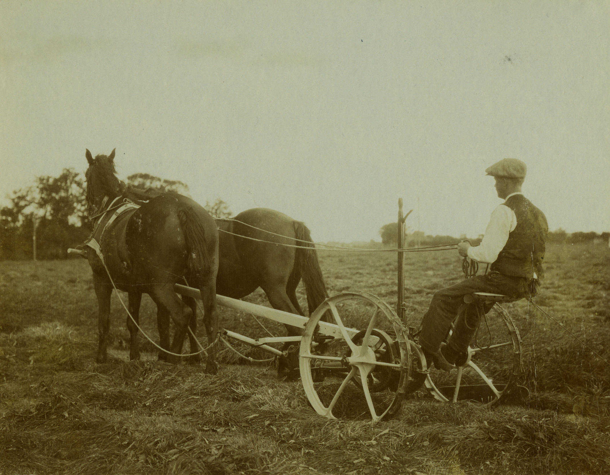 Een man zit op een maaimachine die wordt getrokken door twee paarden.
