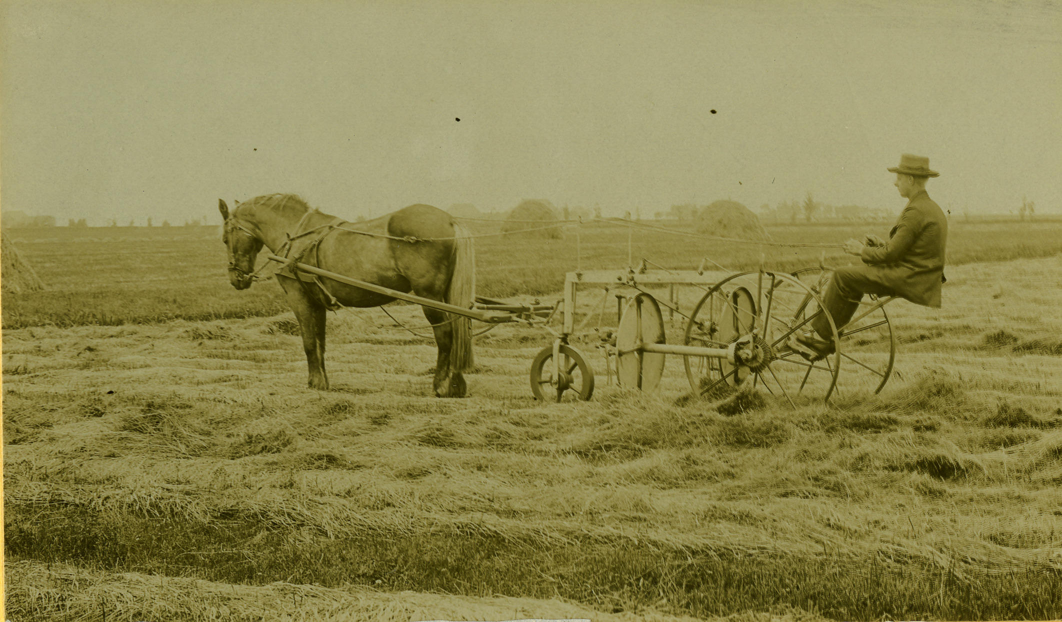 Keren van het hooi met behulp van een hooischudder die achter een paard is gespannen.