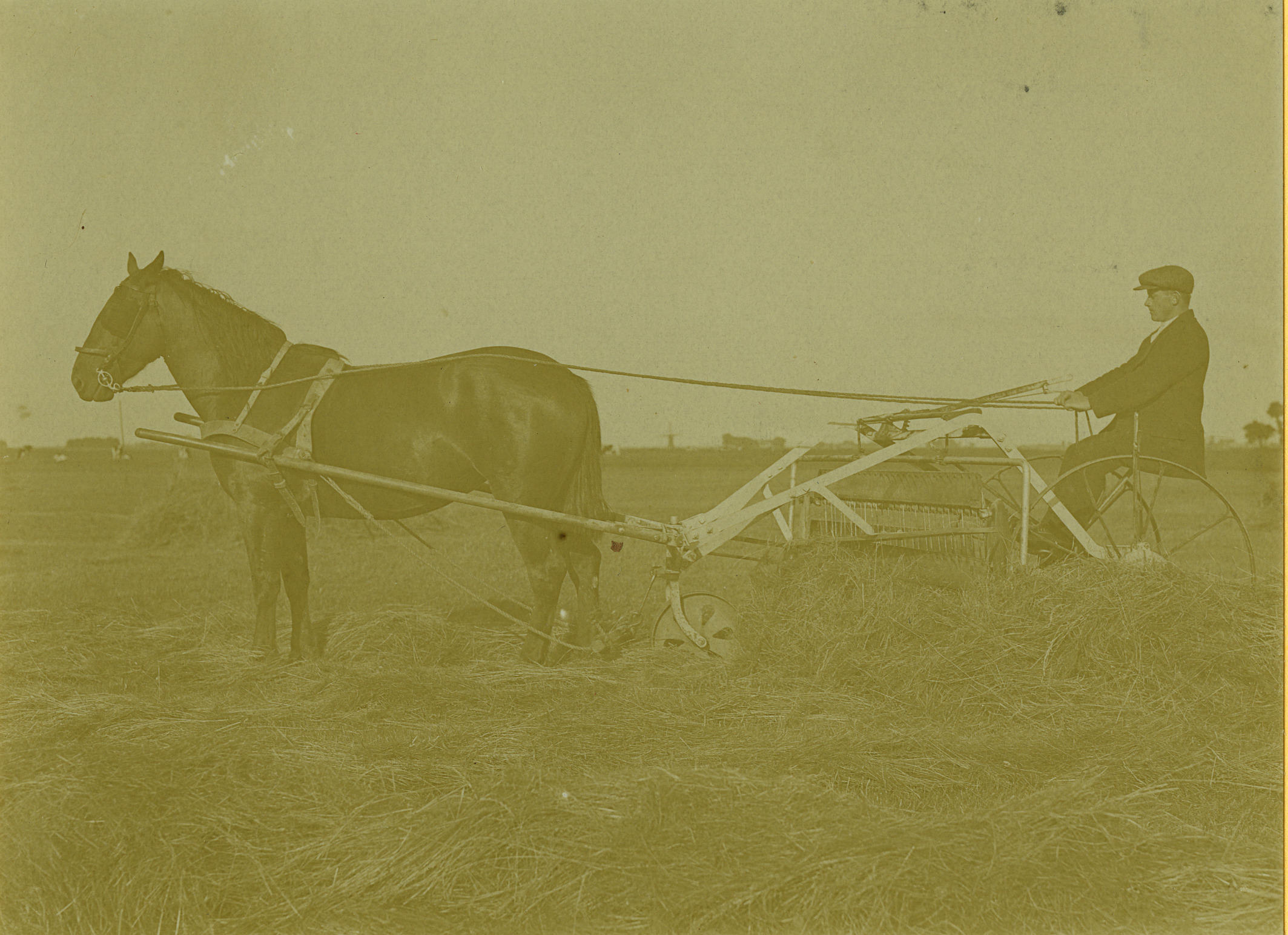 Keren van het hooi met behulp van een hooischudder die achter een paard is gespannen.