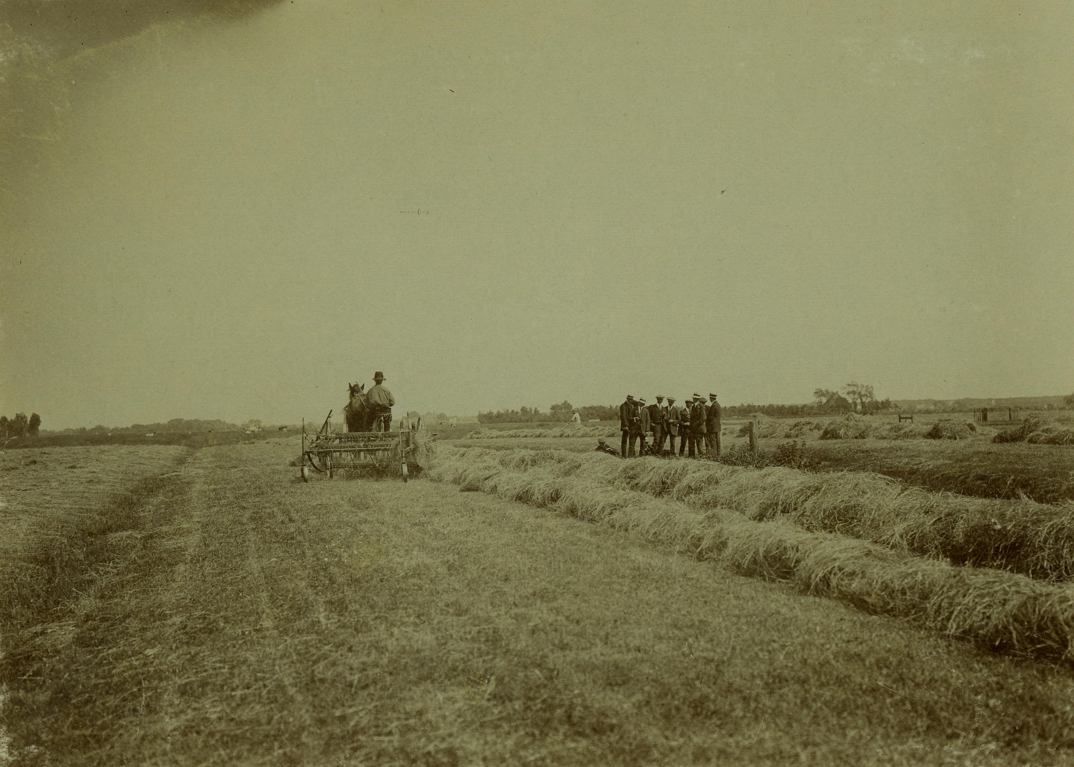 Bijeenbrengen van hooi met paardenkracht, 1914–1934 (zwart-wit foto)
