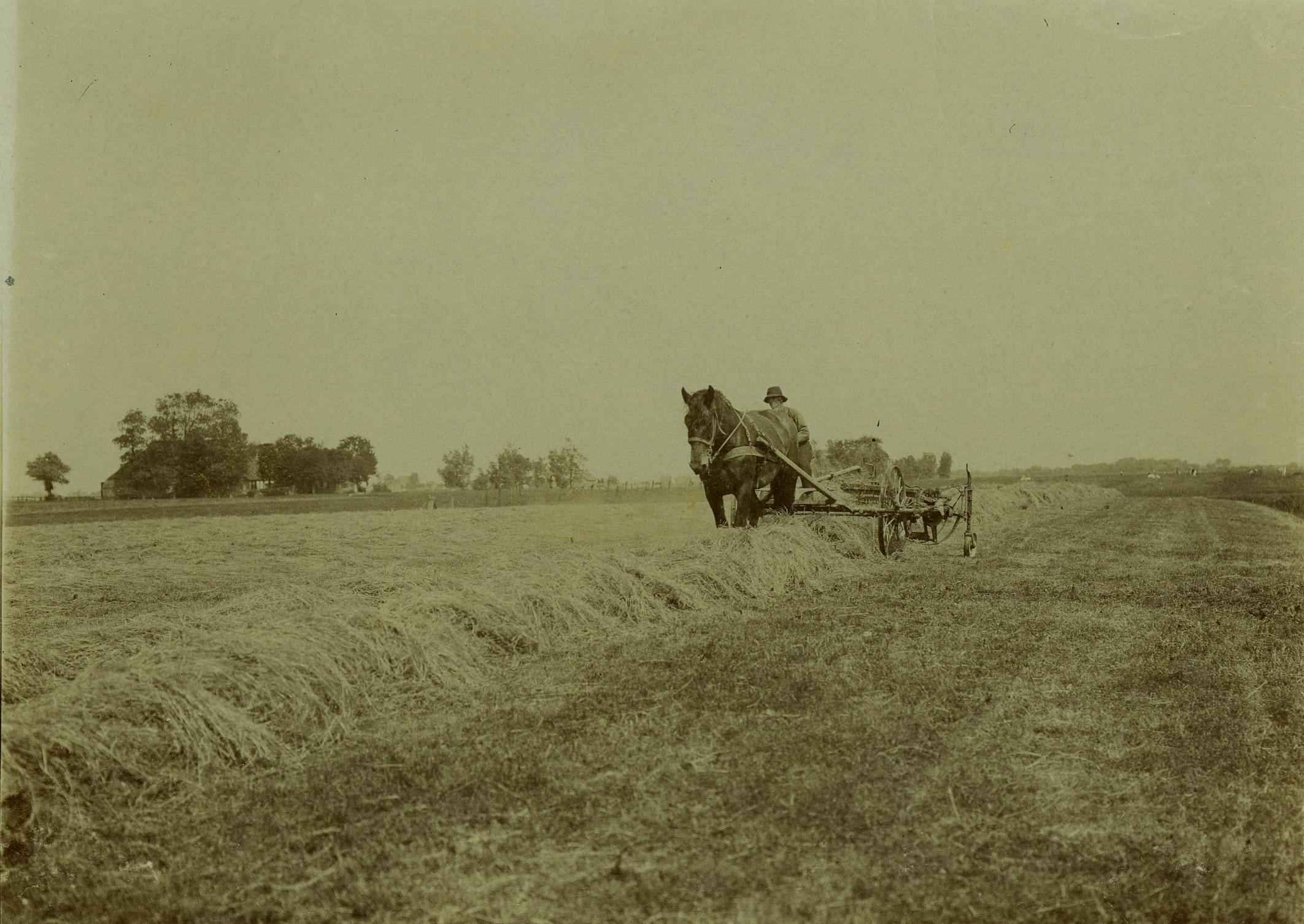 Bijeenbrengen van het hooi met behulp van een harkmachine die achter een paard is gespannen.