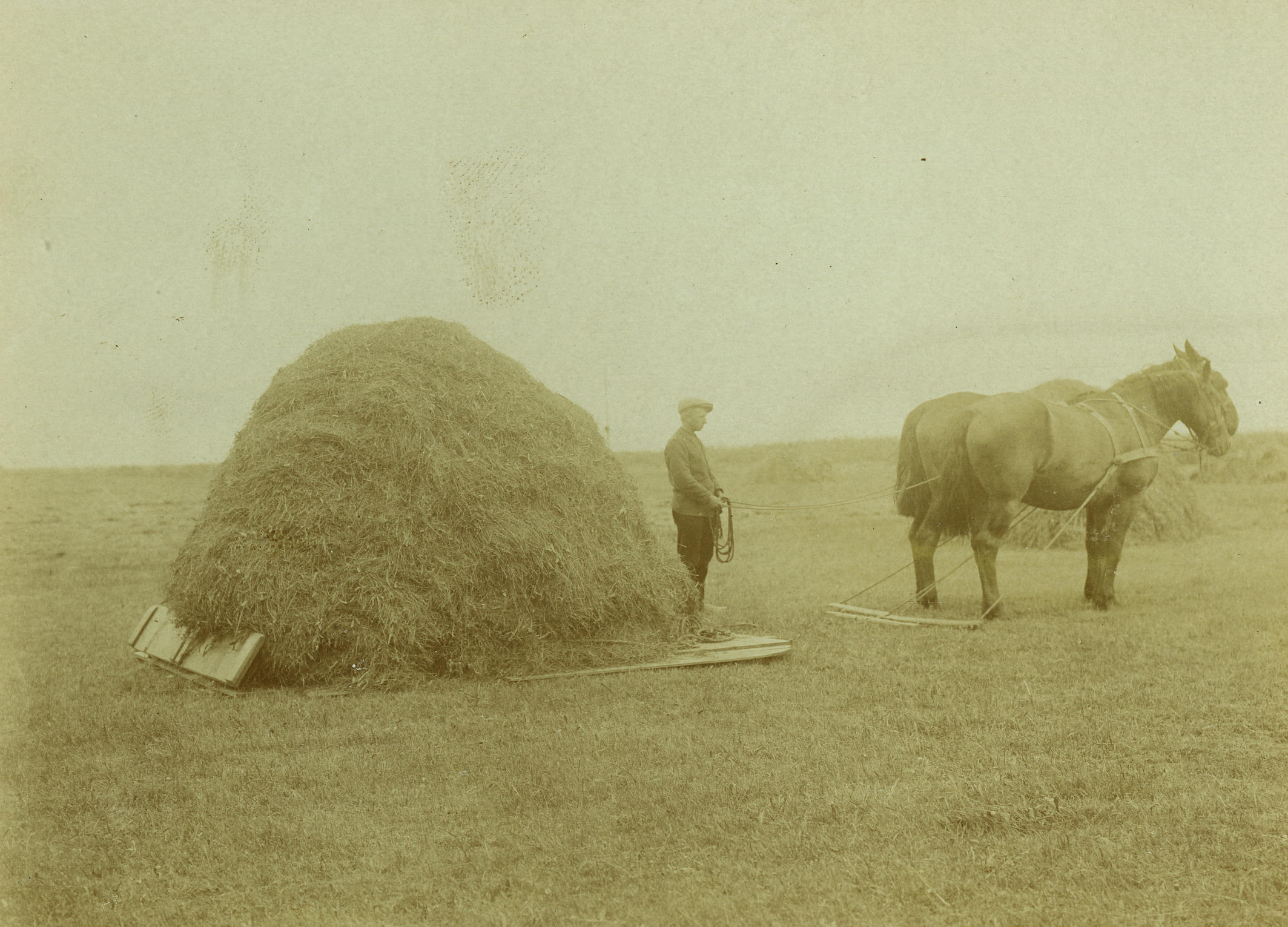 Met behulp van paardenkracht wordt een hooihoop versleept.
